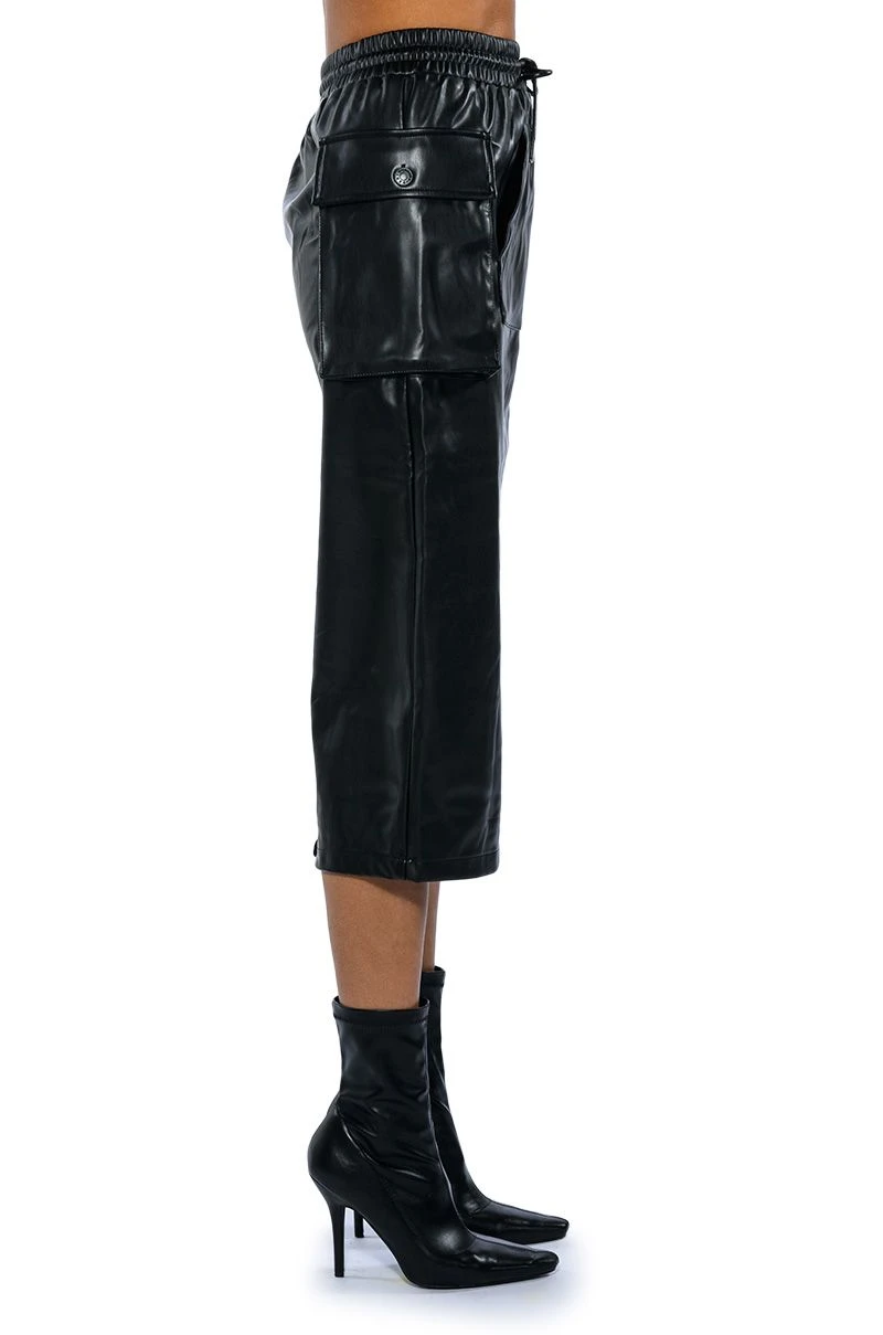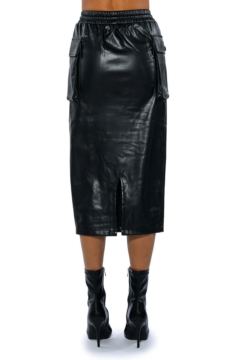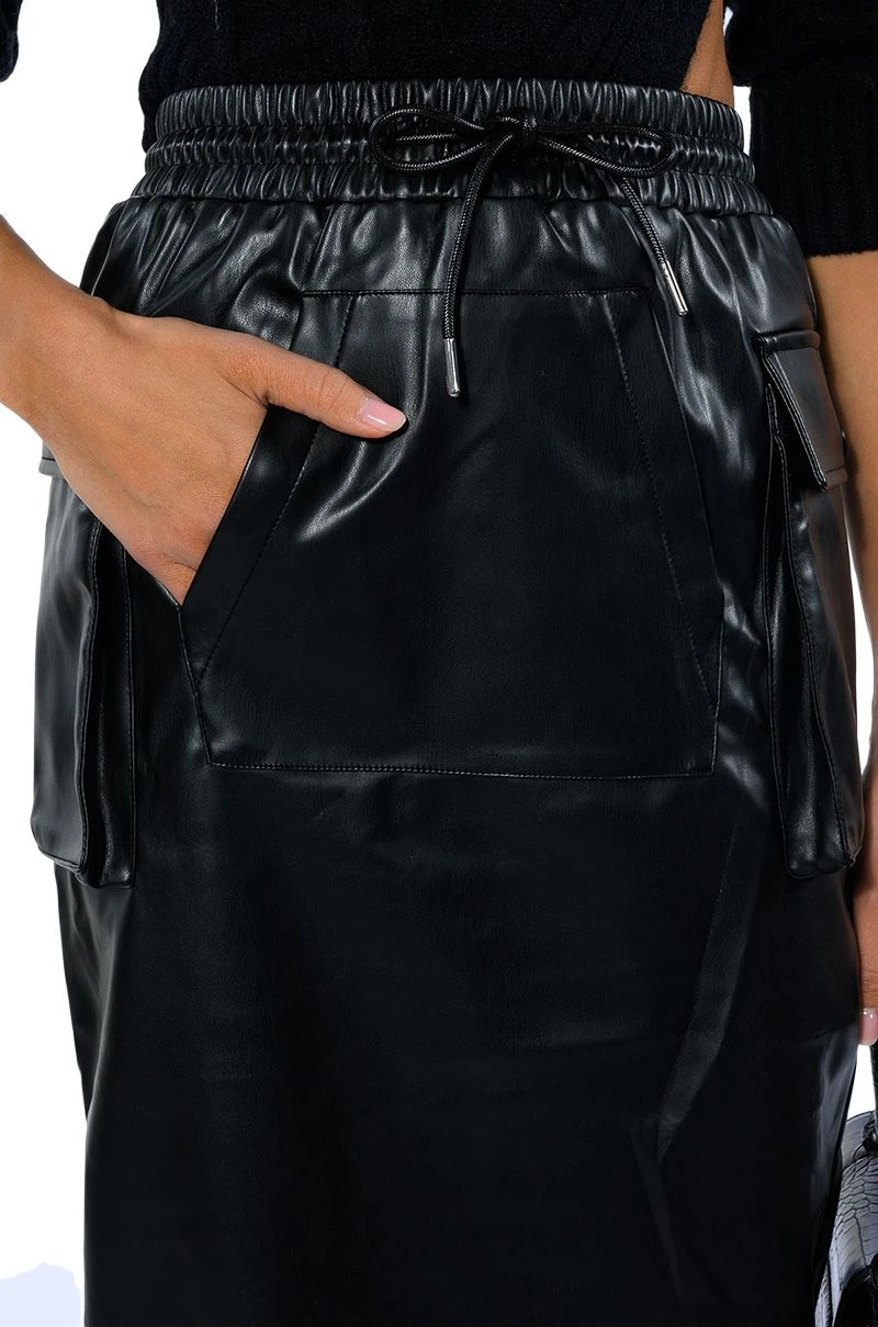 The AKIRA Label Begin Again Faux Leather Midi Skirt features a wide smocked elastic waistband, cargo style side pockets, and a front kangaroo pouch pocket. Complete with silver capped waist drawstrings and a vented back slit for easy movement. Dress it up with a sexy crop tank and a pair of stiletto heel ankle booties for a night out and about.