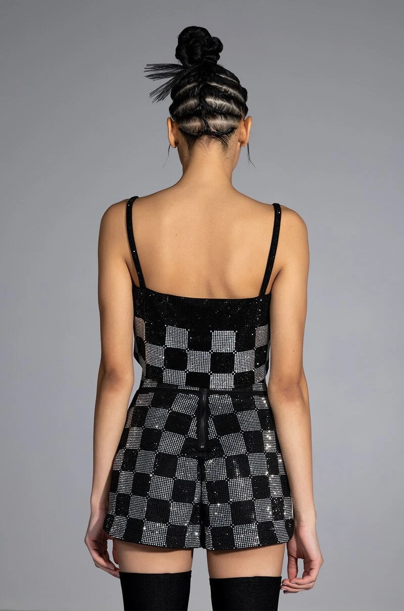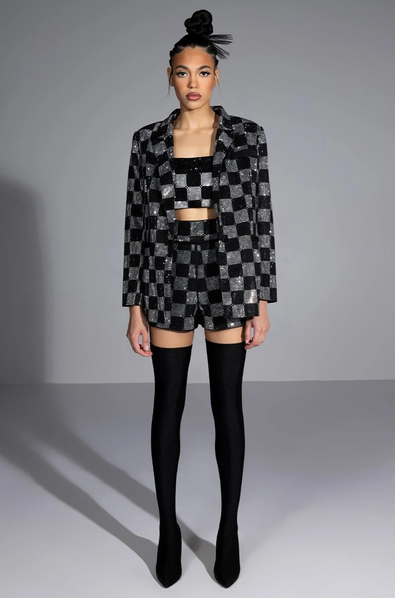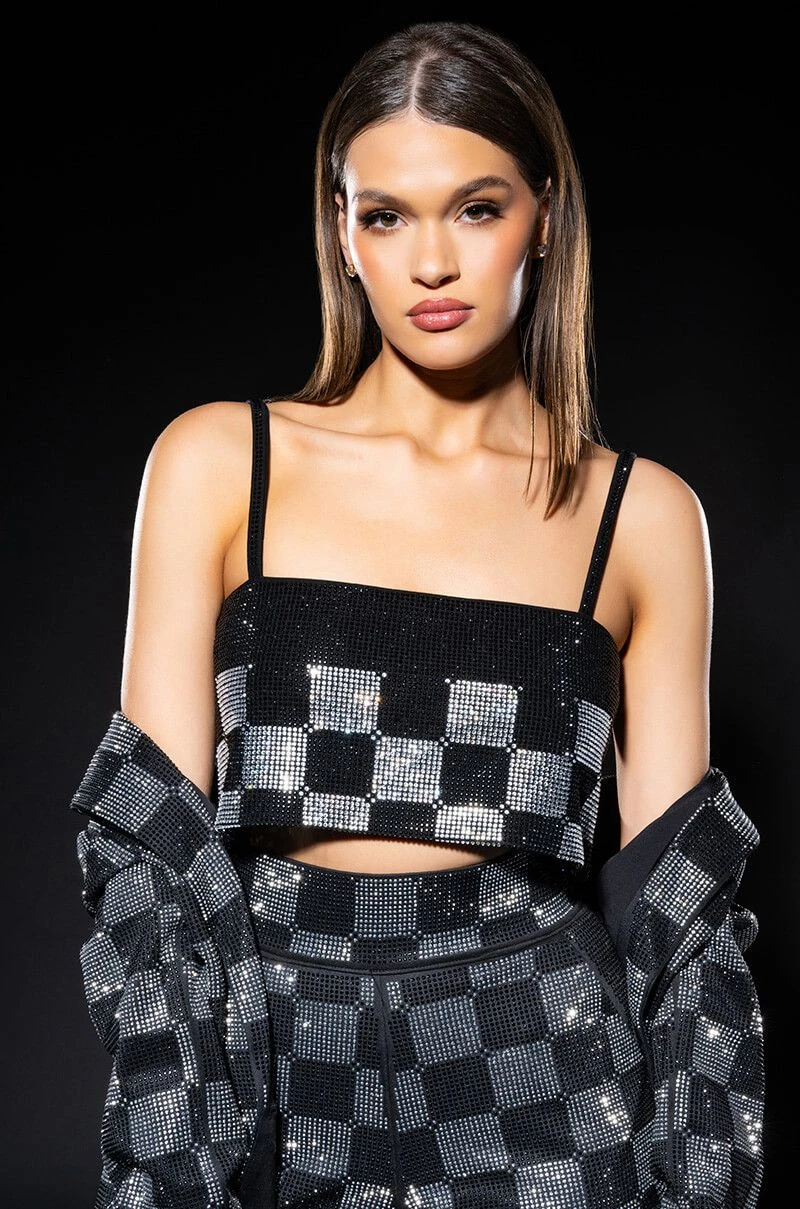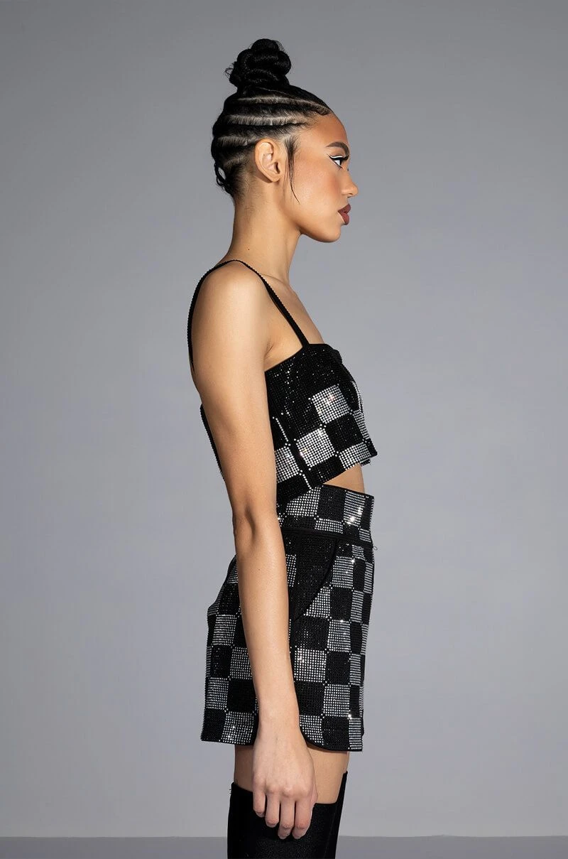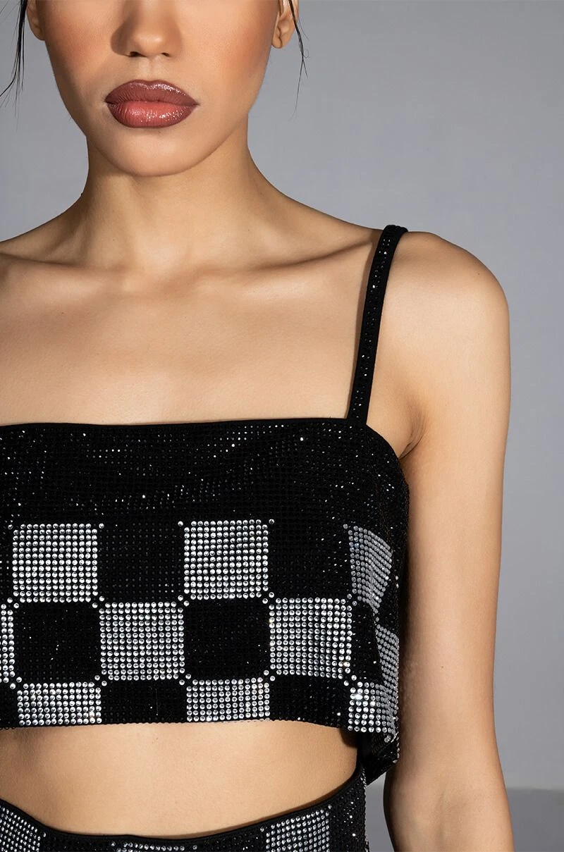 The AKIRA Label Check Mate Rhinestone Bralette features a sleek and smooth fabrication, an ultra-cropped cut, slim tank straps, and rhinestone-embellished check print patterning. Pair this top with the matching AKIRA Label Pop Star Checkered Rhinestone Short and Blazer.