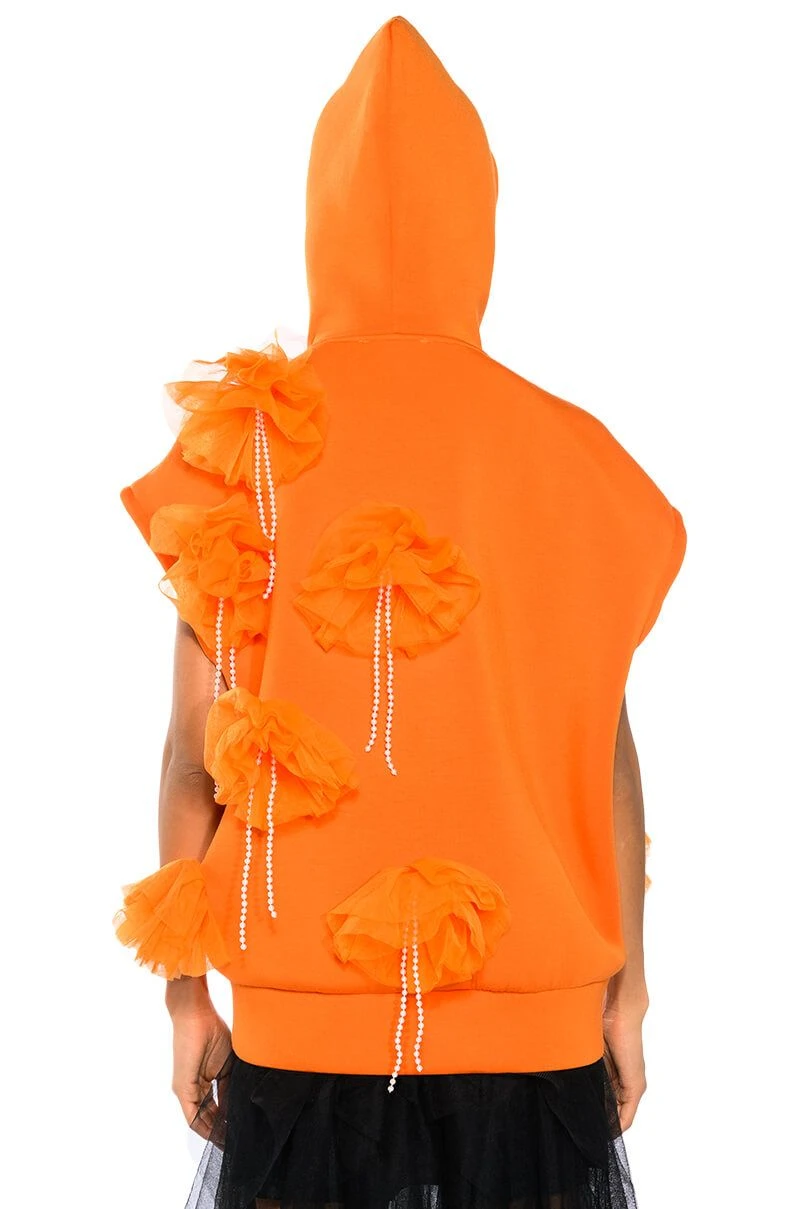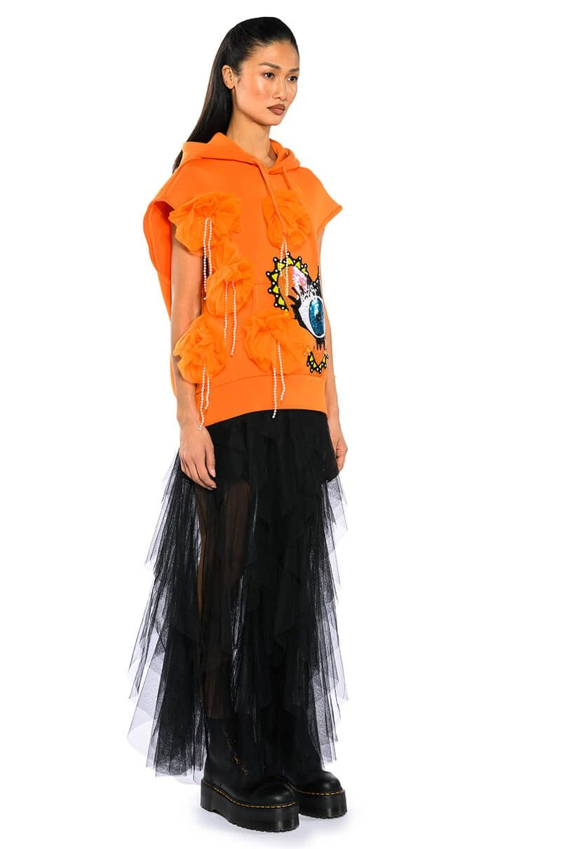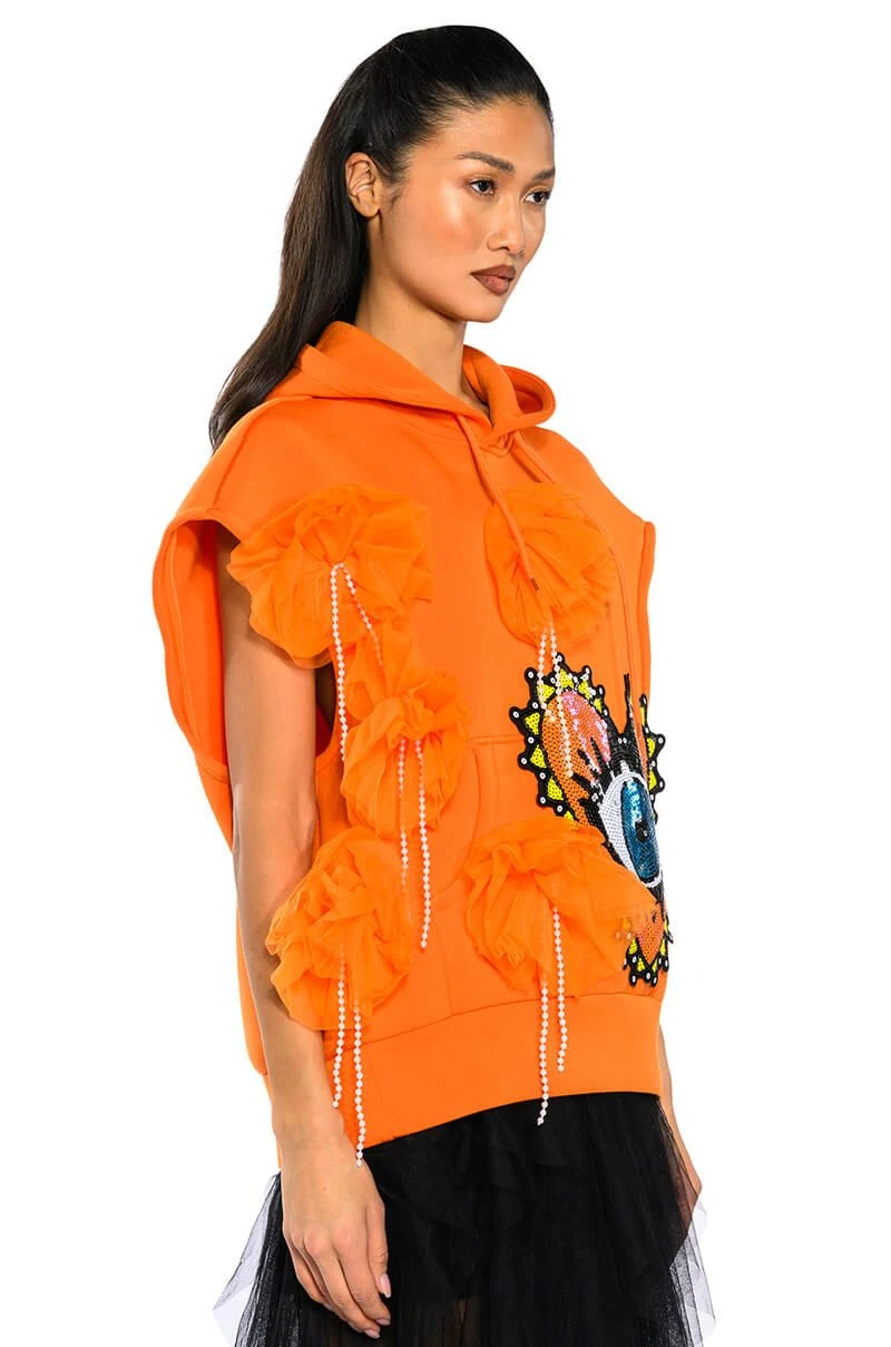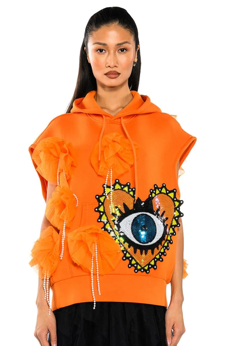 The AKIRA Label Euphoric Embellished Sleeveless Sweatshirt is made from a scuba fabrication and features an attached drawstring hood, a sleeveless silhouette, a boxy design, a mock kangaroo front pocket, and a wide waistband. Complete with a sequin heart eye decal and front and back pearl fringe mesh rosettes.