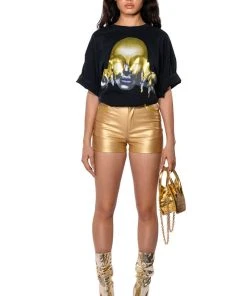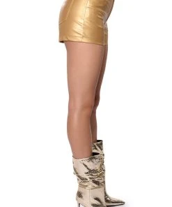 The AKIRA Label Bash Metallic PU Booty Short is made from a metallic vegan leather fabrication and features a high rise waist, working belt loops, a classic five-pocket design with colorblock trim, and a button and zipper front closure.