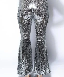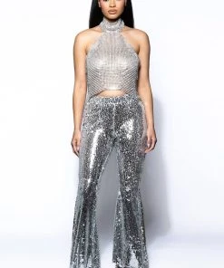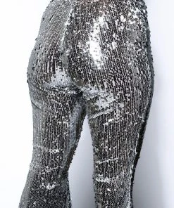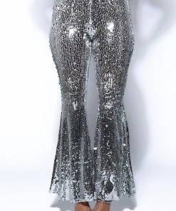 The AKIRA Label Brightness Sequin Flare Pant In Silver features a stretchy sheer mesh base, a high rise waist, a wide elastic waistband, flared pant legs, sequin-embellished detailing, and a pull-on silhouette. Style these with a cropped cardigan and slip on sneakers for a complete, comfy fit.