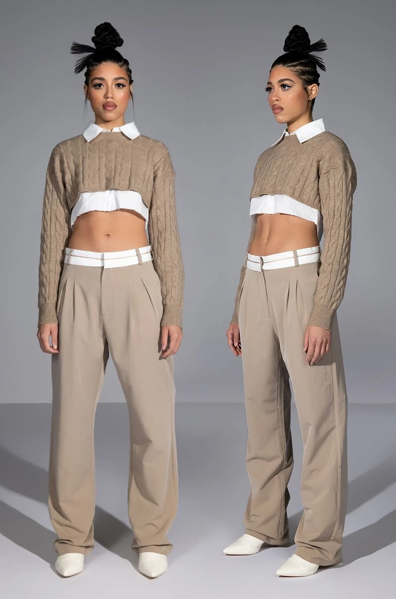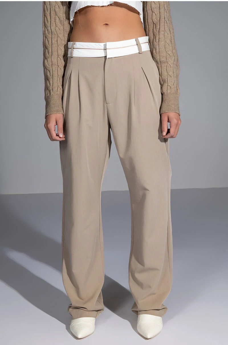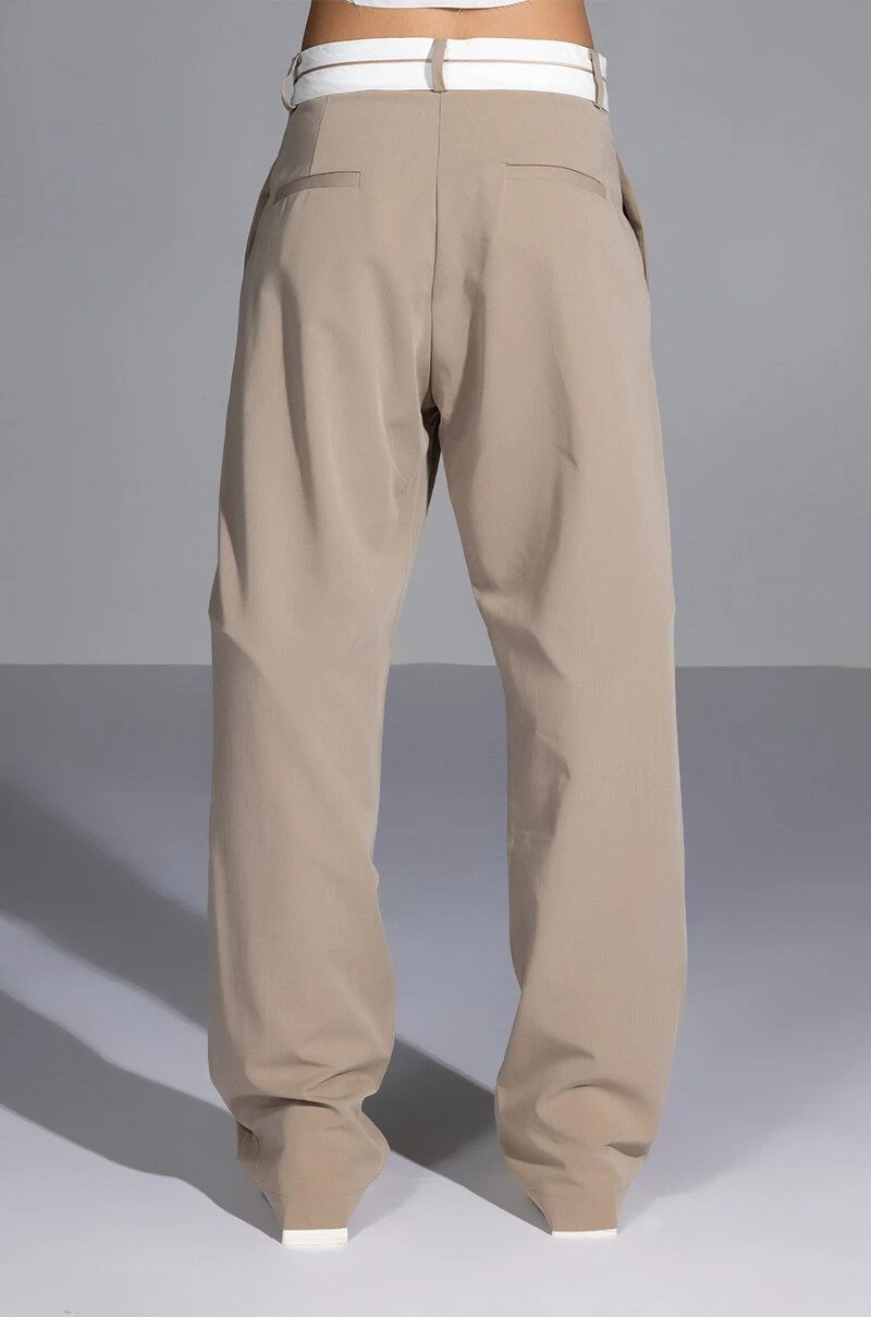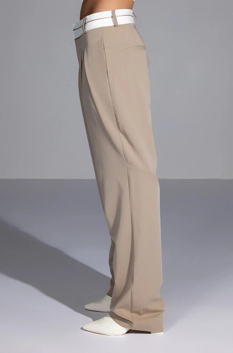 The AKIRA Label Certified Boss Wide Leg Trouser features a smooth, lightweight fabrication, a high rise waist, a wide fold over-inspired waistband, working belt loops, on seam slant side pockets, pleat front detailing, jetted back pockets, and a wide leg silhouette. Complete with a hook and eye clasp and zipper front closure. Pair this suited-up piece with a mock neck top and pumps to complete your tailored look.