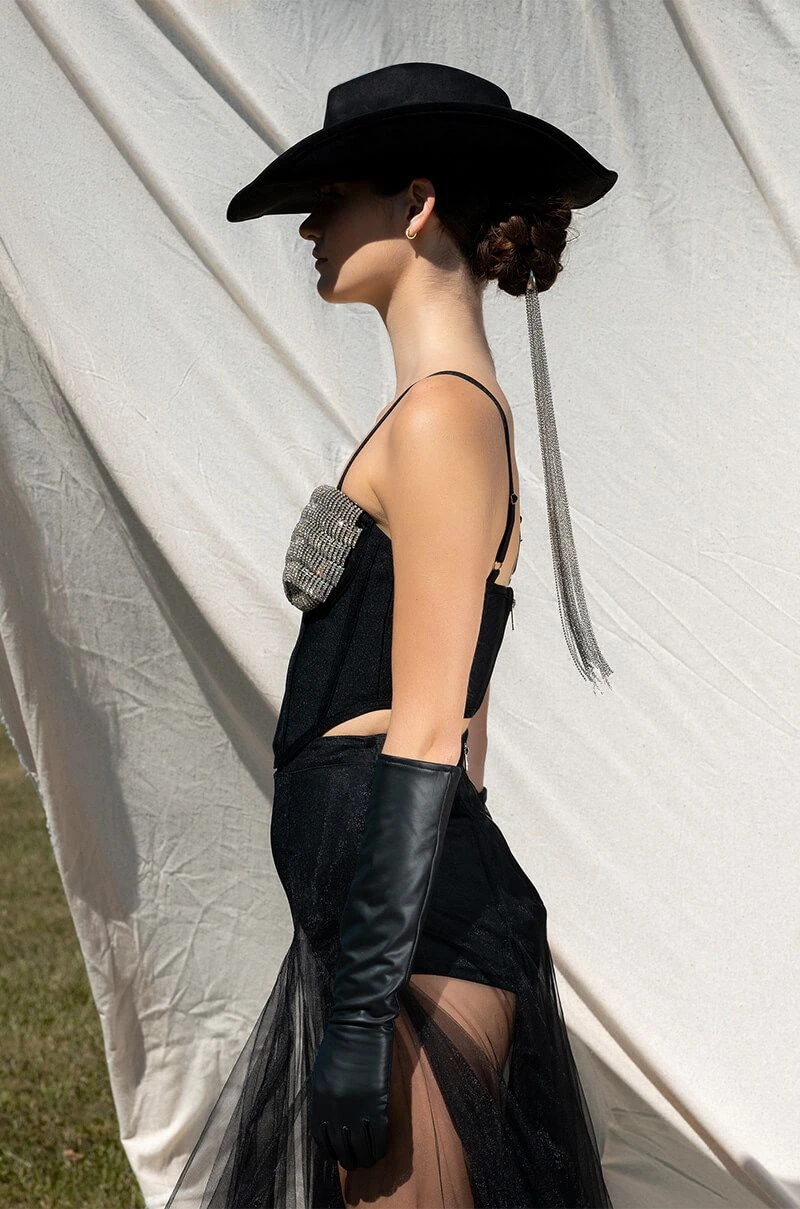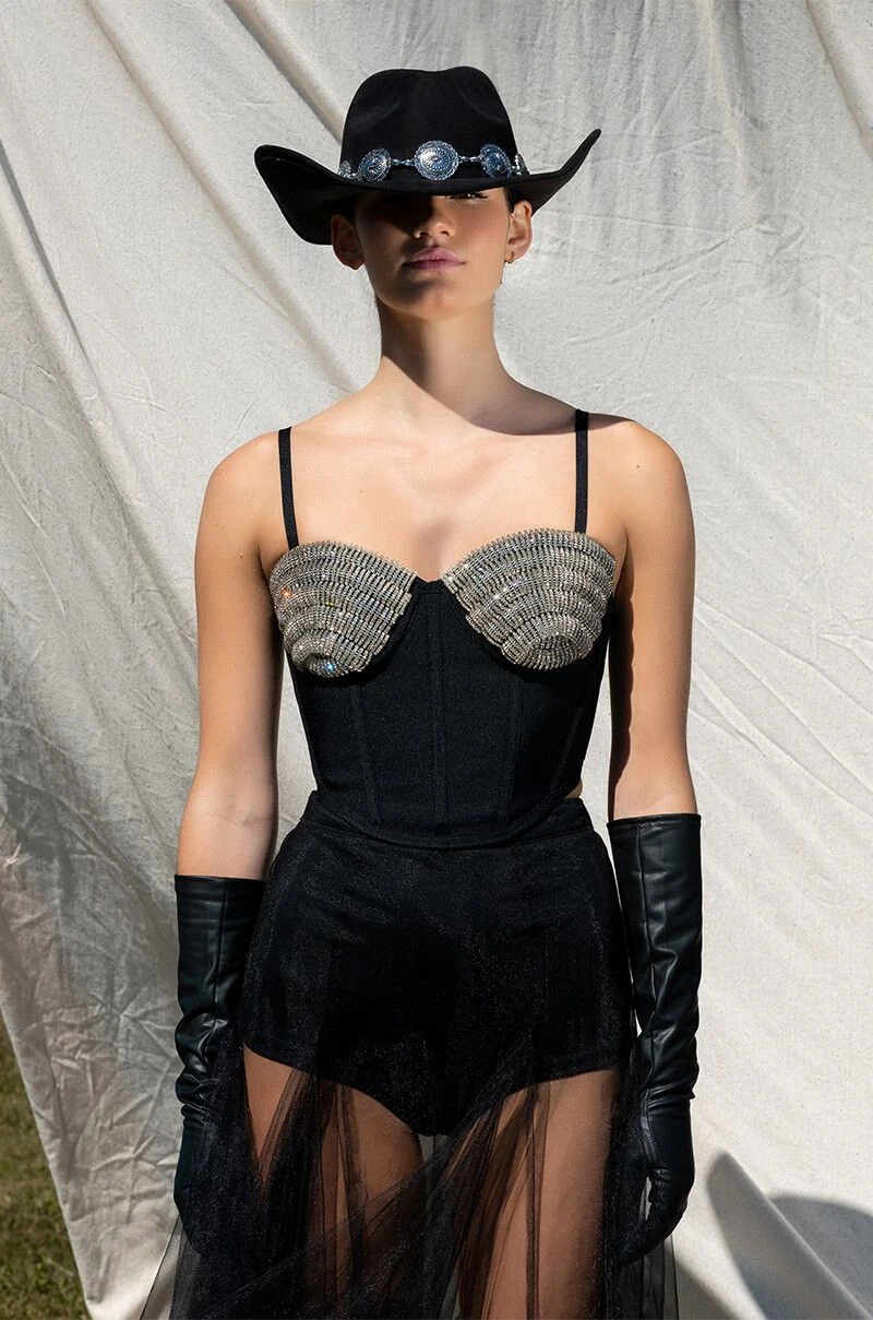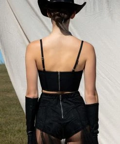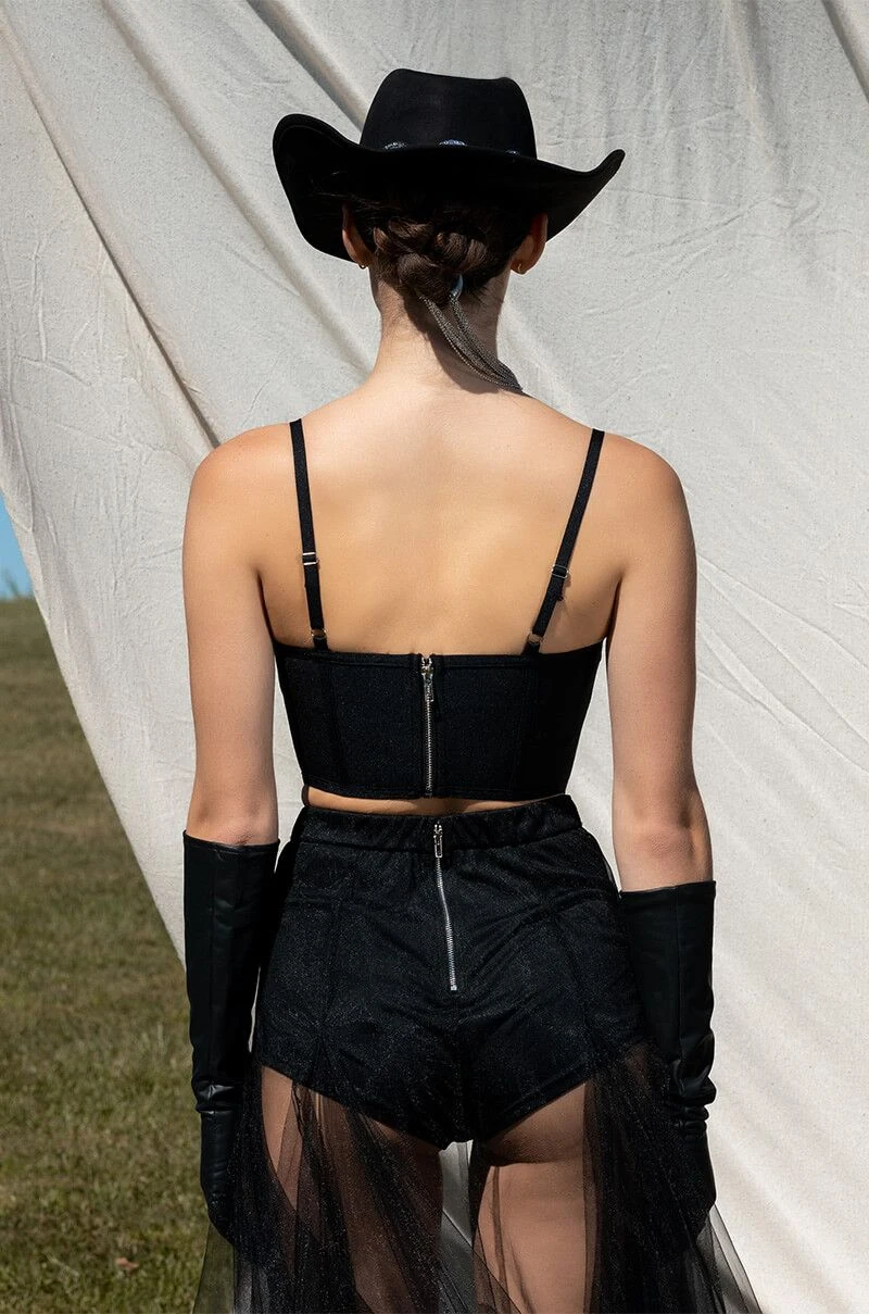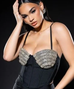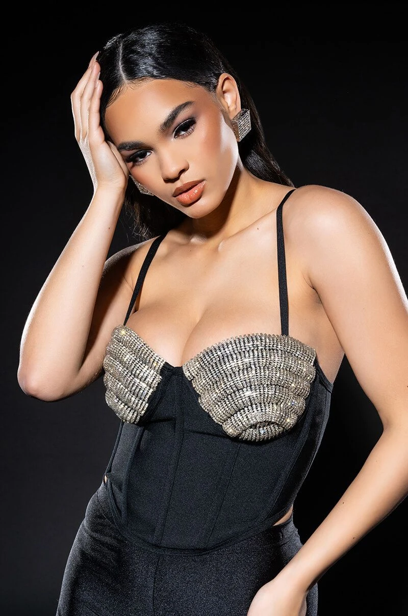 Cheers! The AKIRA Label Champagne Wishes Embellished Corset is made from a smooth bandage fabrication and features adjustable tank straps, a sweetheart neckline, padded cups with layered rhinestone link detailing, boning for structure, a cropped silhouette, and a pointed hem. Complete with an exposed back zipper closure.
