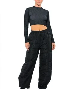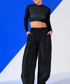 The AKIRA Label Double Up Puffer Pull On Jogger is made from a slick fabrication and features a high rise waist, a ruched elastic waistband with toggle drawstring detail, slant side pockets, wide puffer pant legs, and velcro ankle hems. Pair this piece with a mock neck sweater and furry booties to complete your cozy cute look.