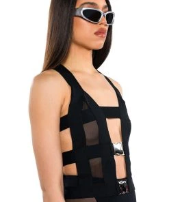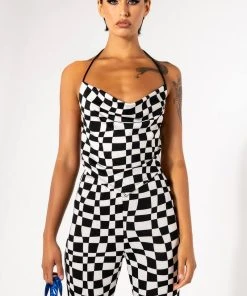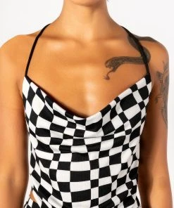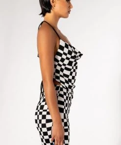 The AKIRA Label Down To Business Cowl Neck Mesh Crop Top is made from a soft knit mesh fabrication and features a warped checkered pattern, a halter neck tie, a cowl neckline, handkerchief top design, cropped silhouette, and a tie back closure. Pair this piece with the matching AKIRA Label Down To Business Mesh Flare Pant and booties to complete your look.
