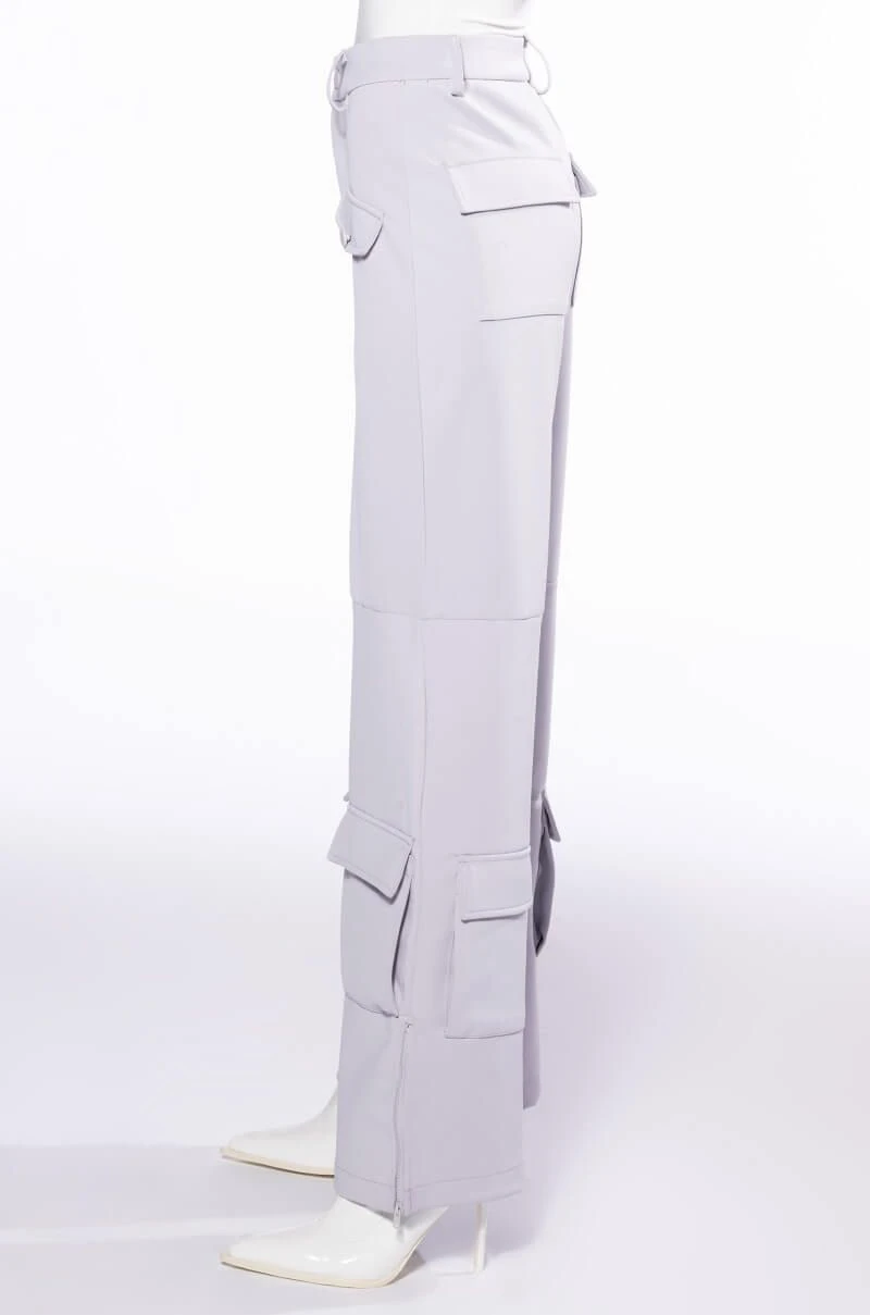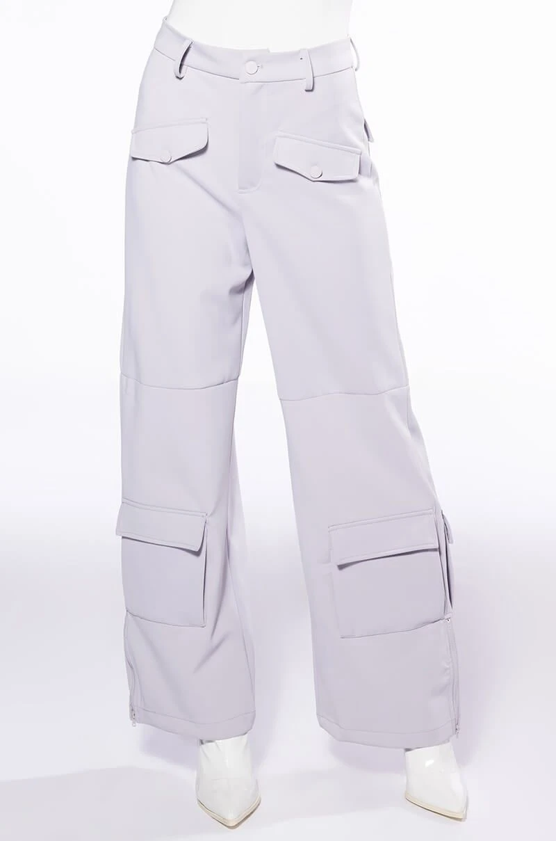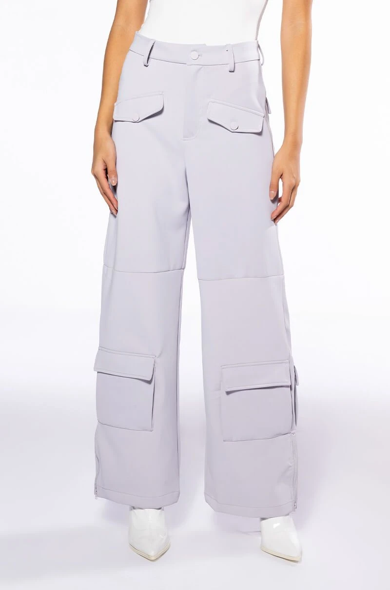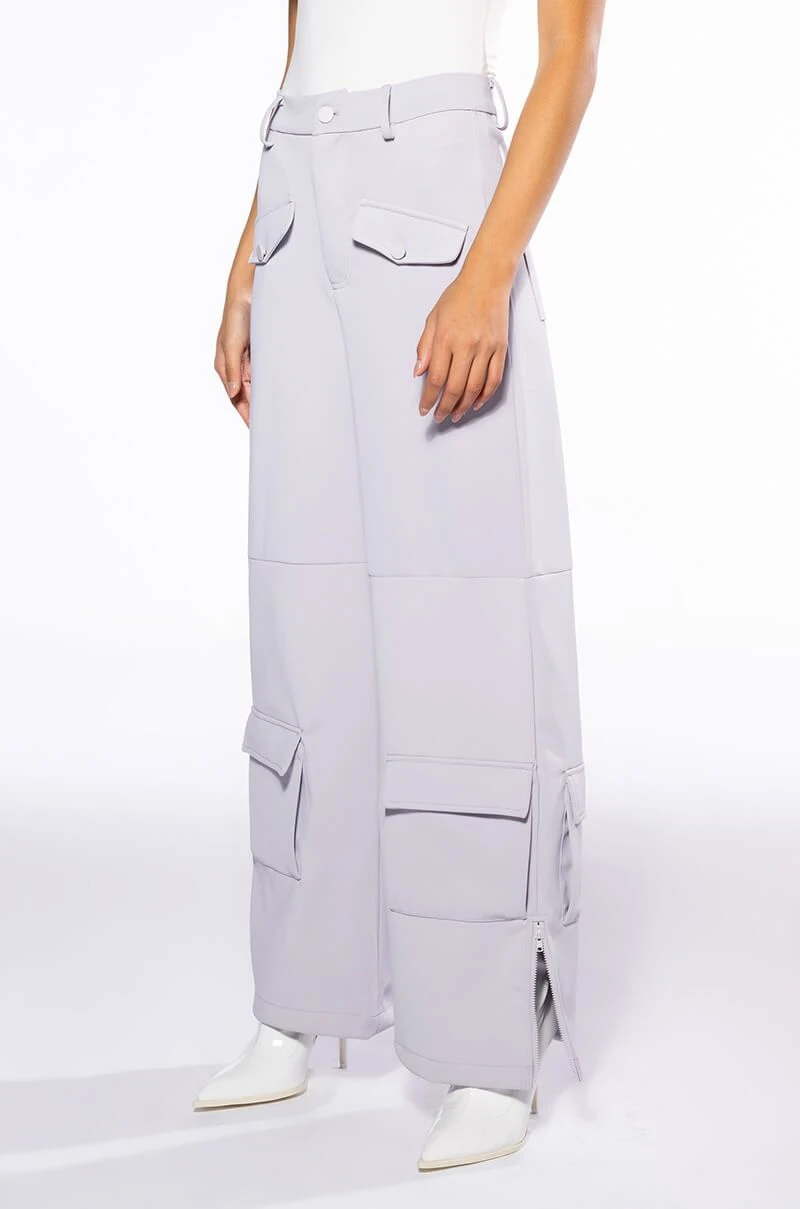 The AKIRA Label Elevated Cargo Pants In Light Grey are an elegant take on the cargo pant trend featuring a soft scuba knit base, a high rise waist, functioning belt loops, faux button front slant side pockets, flap front cargo back pockets, and coordinating flap front ankle cargo pockets at the front and back. Complete with a wide leg silhouette, zippered side slit hem detailing, and a zip button front closure.