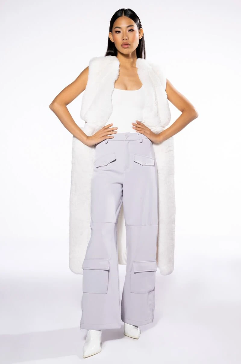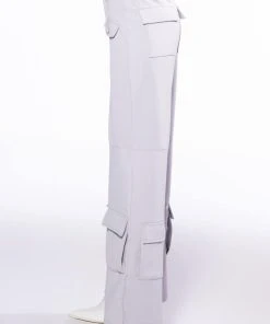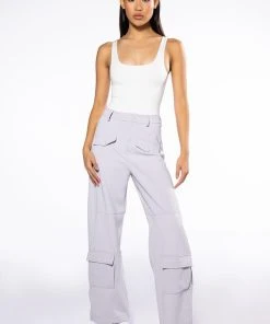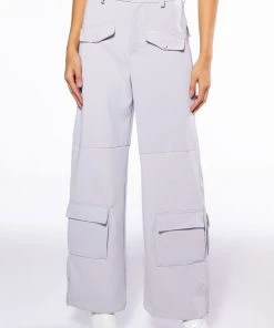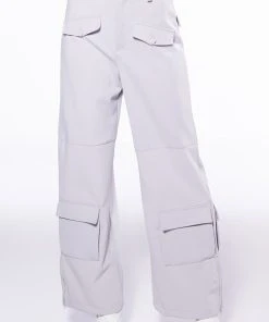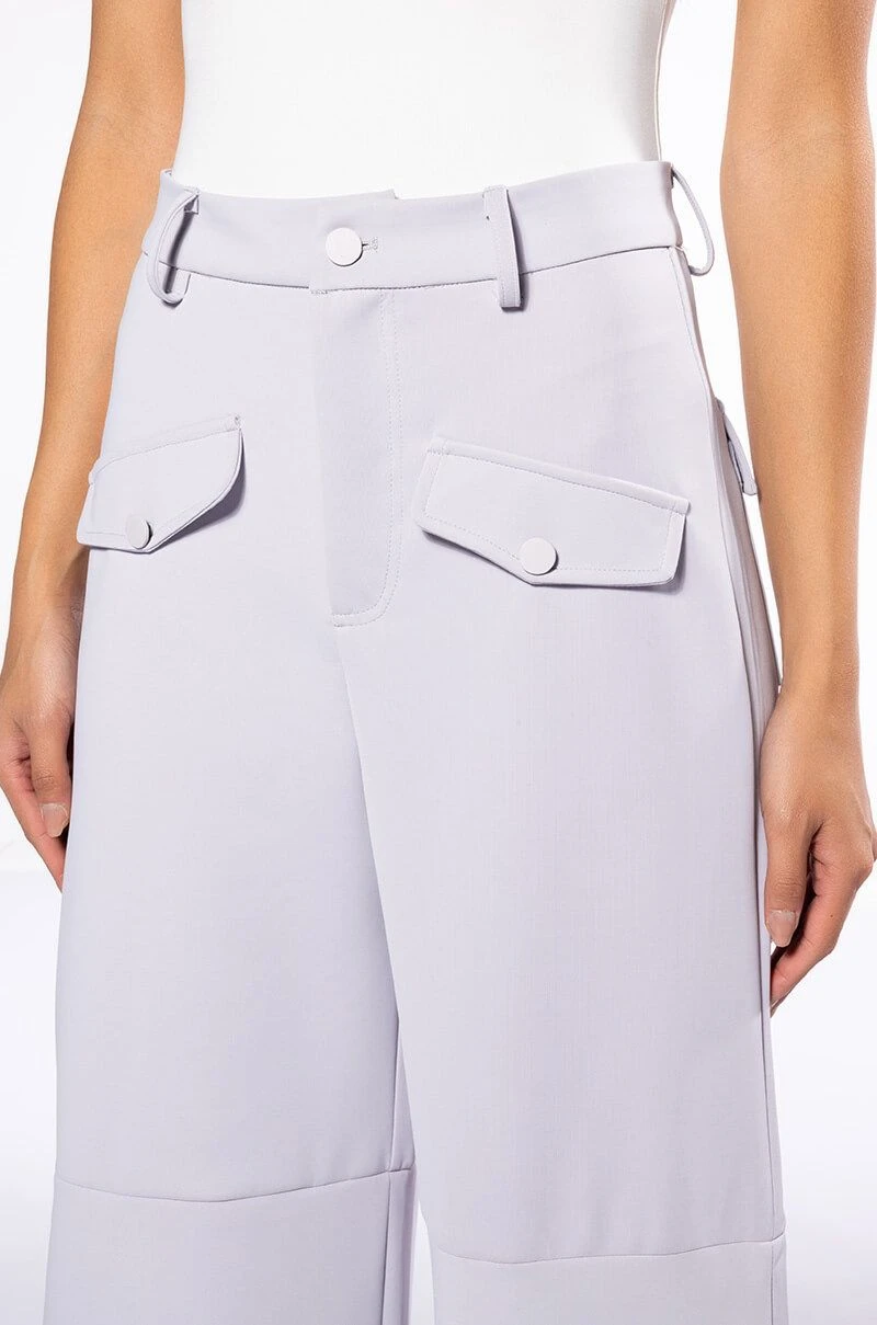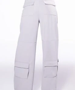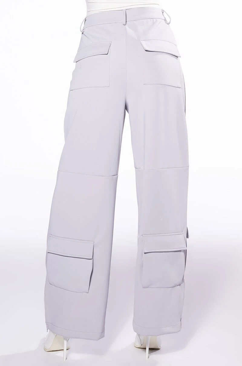The AKIRA Label Elevated Cargo Pants In Light Grey are an elegant take on the cargo pant trend featuring a soft scuba knit base, a high rise waist, functioning belt loops, faux button front slant side pockets, flap front cargo back pockets, and coordinating flap front ankle cargo pockets at the front and back. Complete with a wide leg silhouette, zippered side slit hem detailing, and a zip button front closure.