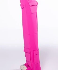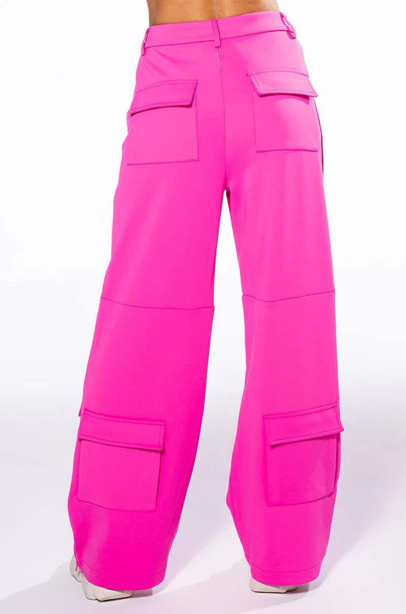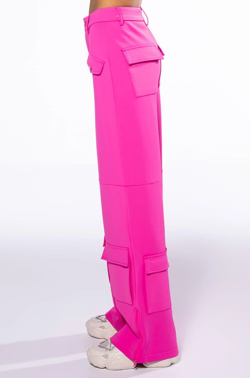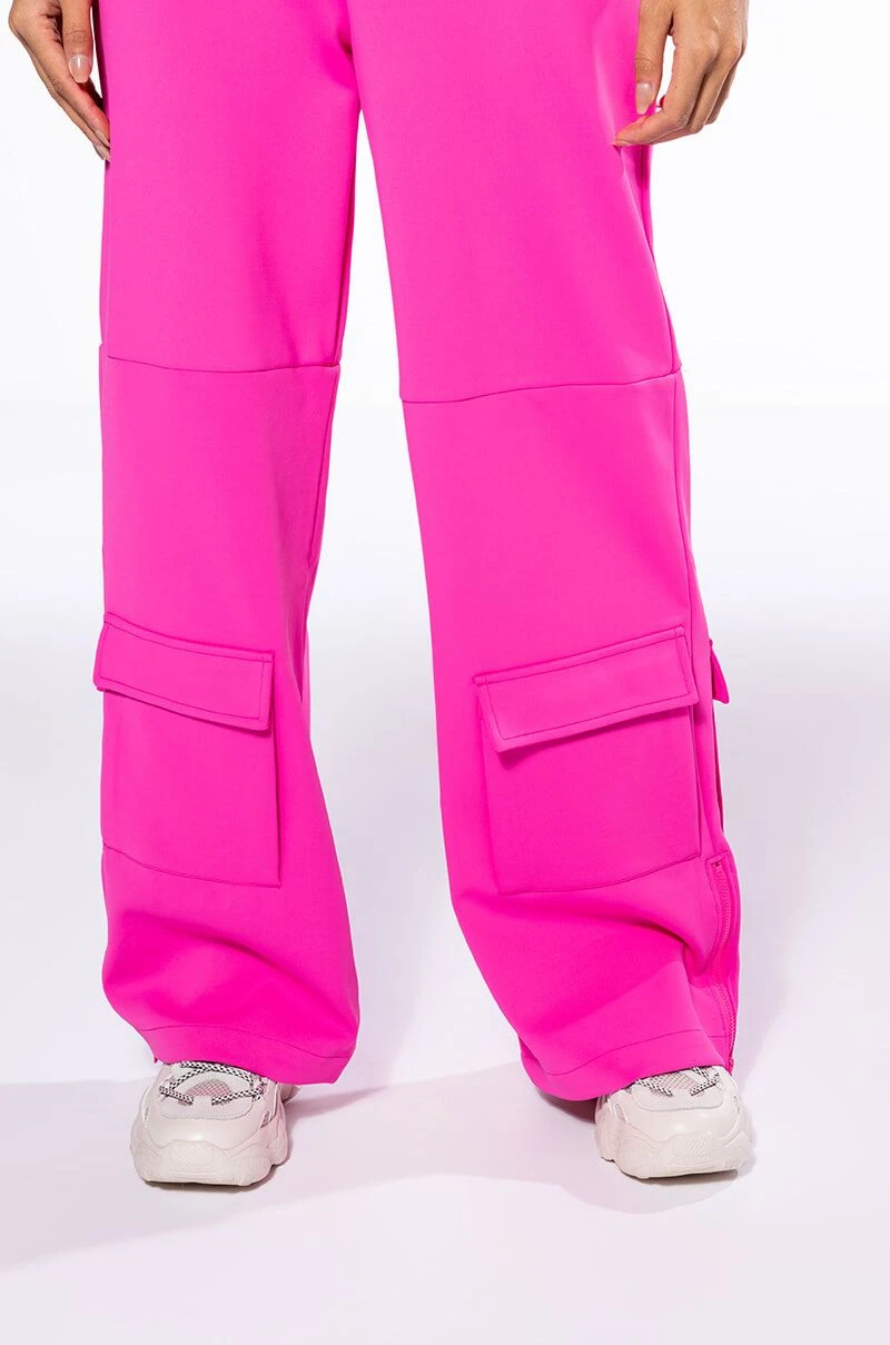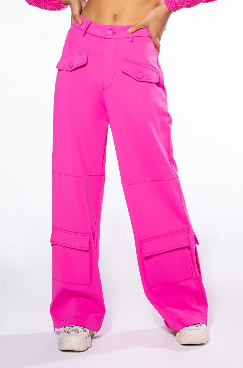 The AKIRA Label Elevated Cargo Pants In Pink are an elegant take on the cargo pant trend featuring a soft scuba knit base, a high rise waist, functioning belt loops, faux button front slant side pockets, flap front cargo back pockets, and coordinating flap front ankle cargo pockets at the front and back. Complete with a wide leg silhouette, zippered side slit hem detailing, and a zip button front closure.