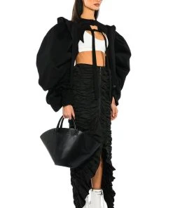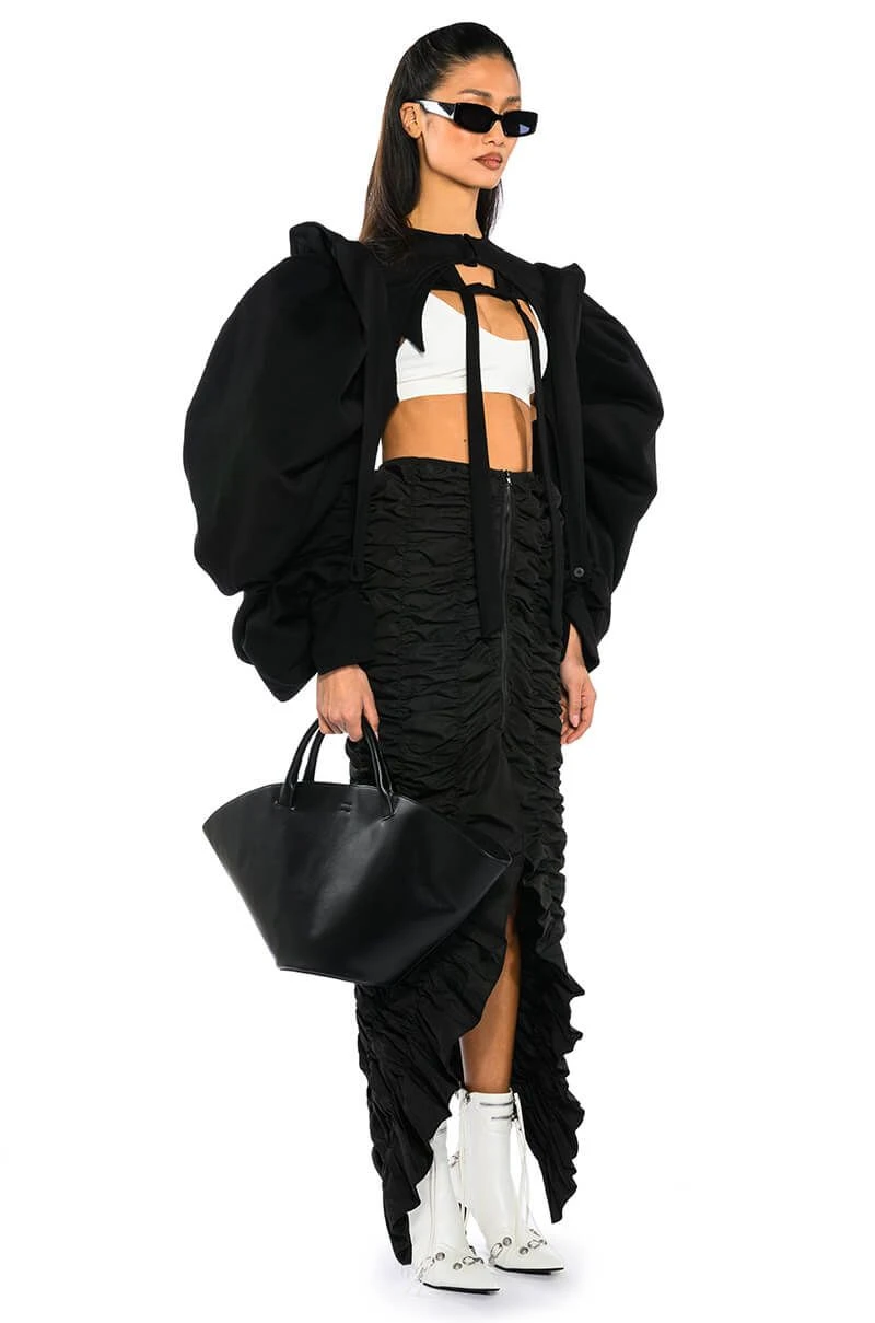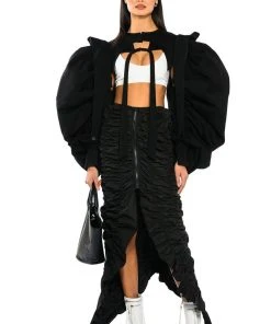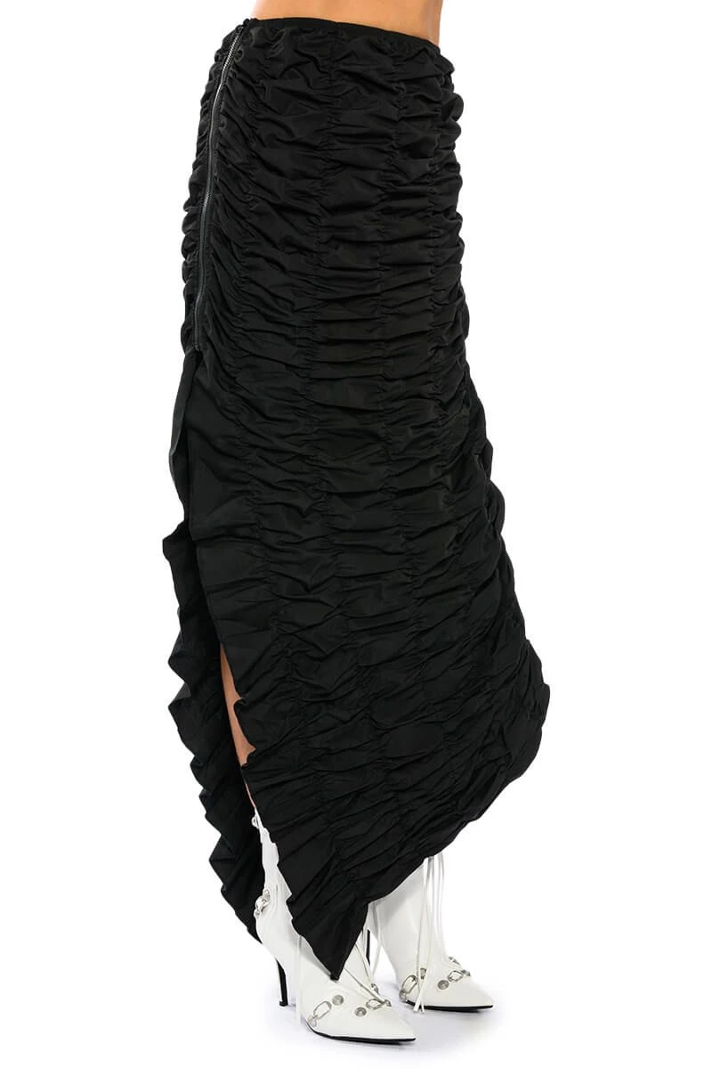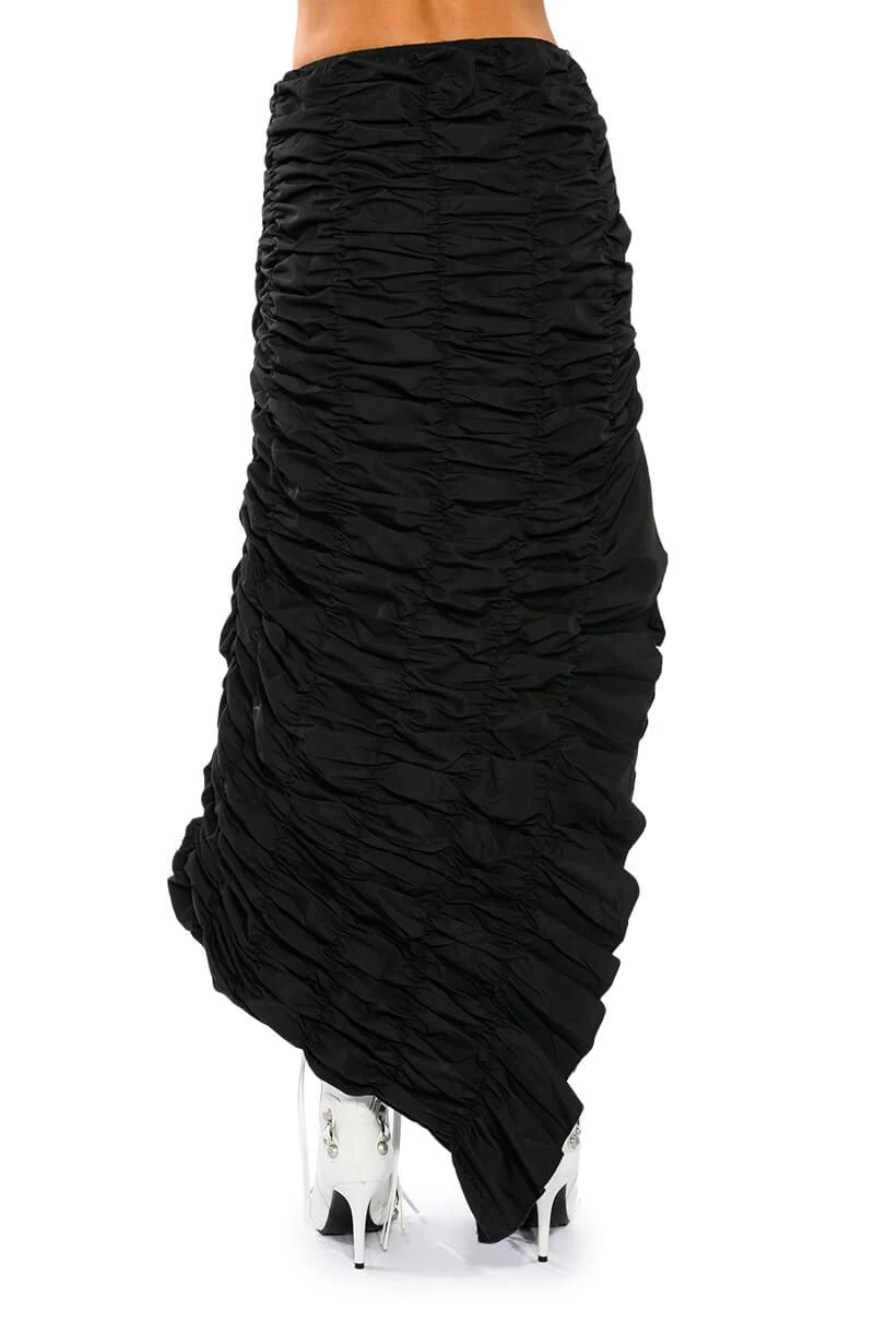 Steal the show with The Encore Scrunched Slit Maxi Skirt! This form-fitting maxi length skirt is made from a polyester and cotton fabrication, featuring a smocked elastic waist line, all over ruched detailing, a tonal side zipper closure, and a thigh-high scrunched side split. Pro tip: switch the side split and zipper to the back for a sexy ruched look! Pair this piece with a cropped top and chunky heeled boots to complete your effortless look.