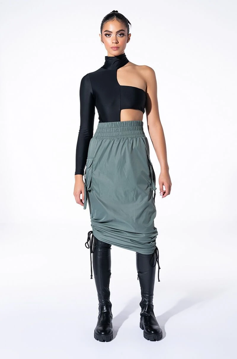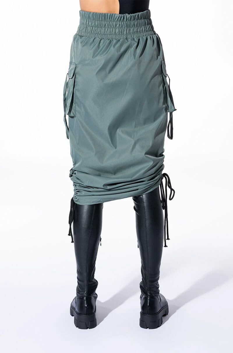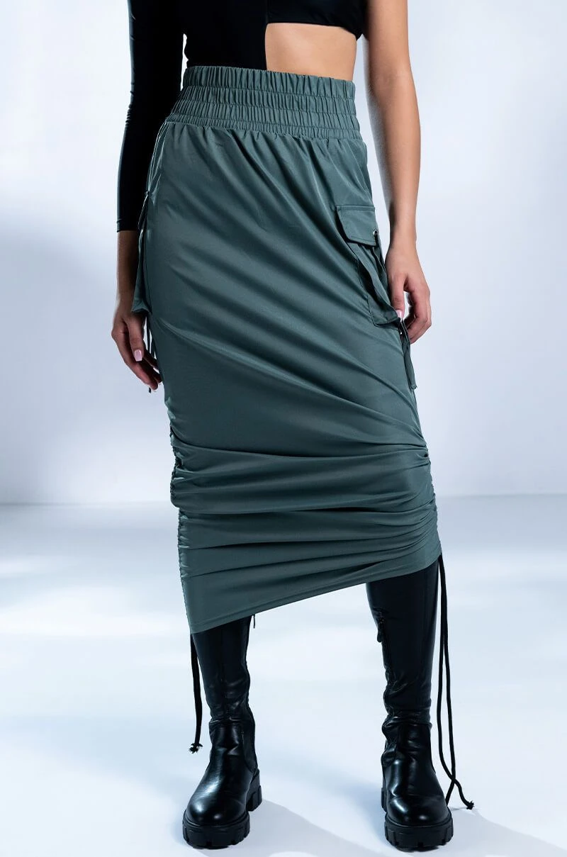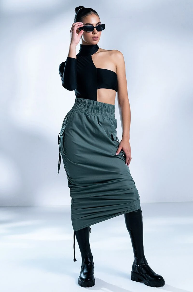 Take the lead with The AKIRA Label Follow Me Adjustable Cargo Skirt In Olive! This amped-up athleisure piece is made from a light cargo fabrication and features a high rise waist with a shirred, wide elastic waistband, strappy side flap pockets, and an adjustable hem with ruched side drawstring detailing.