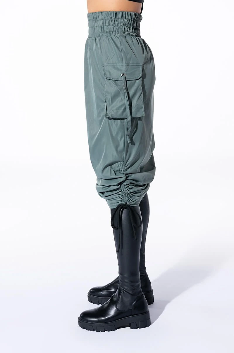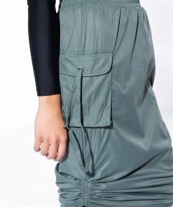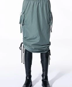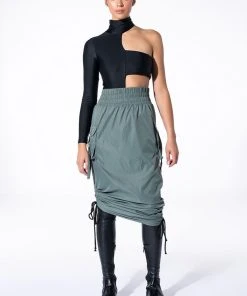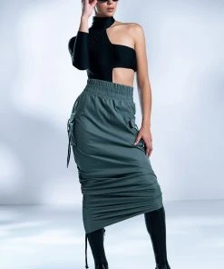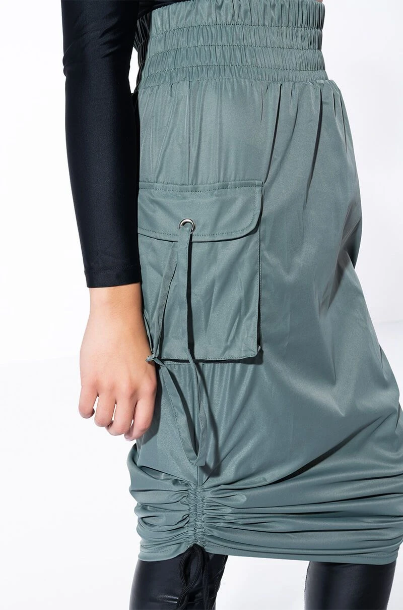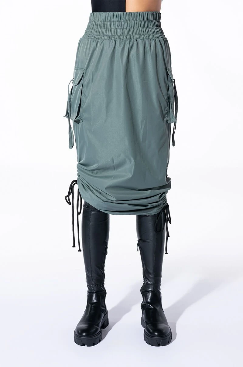 Take the lead with The AKIRA Label Follow Me Adjustable Cargo Skirt In Olive! This amped-up athleisure piece is made from a light cargo fabrication and features a high rise waist with a shirred, wide elastic waistband, strappy side flap pockets, and an adjustable hem with ruched side drawstring detailing.