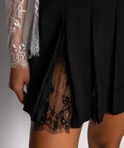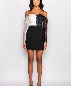 The AKIRA Label Ginger Lace Pleated Mini Skirt features a classic stretch knit fabrication, a pleated design, lace cut out pleated panel detailing, a side zipper closure, and a high rise waistline. Complete your look with a cropped blouse and strappy sandals.