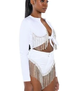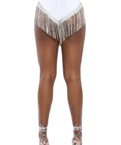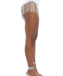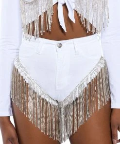 The AKIRA Label Gonna Love Me Waterfall Rhinestone Denim Short is a high cut, ultra-glam cheeky denim bottom complete with a high rise waist, belt loops, mock front pockets, back pockets, and fringe hem detailing. Complete with rhinestone fringe hem detailing and a classic front button fly closure.