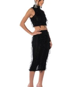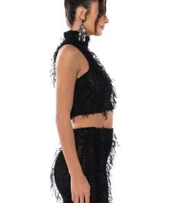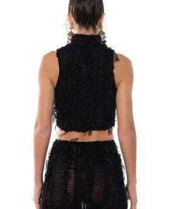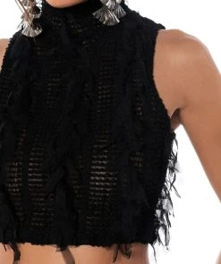 The AKIRA Label Its A Wrap Macrame Mesh Sleeveless Mock Neck Top is made from a stretchy sheer mesh fabrication and features textured netting with fringe column body detailing, a ruffled mock neckline, a sleeveless design, a slip-on fit, and a slightly cropped silhouette. Complete your look with the coordinating AKIRA Label Its A Wrap Macrame Mesh Bodycon Midi Skirt.