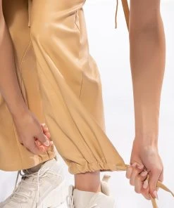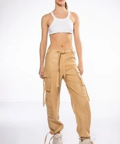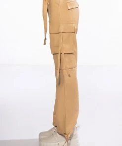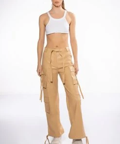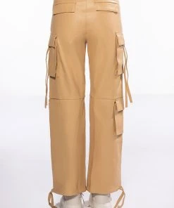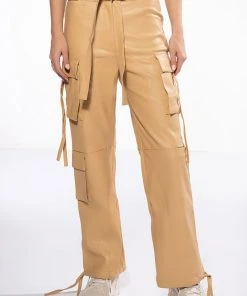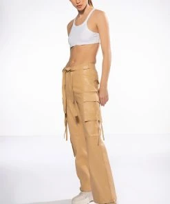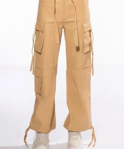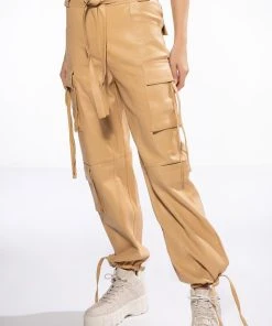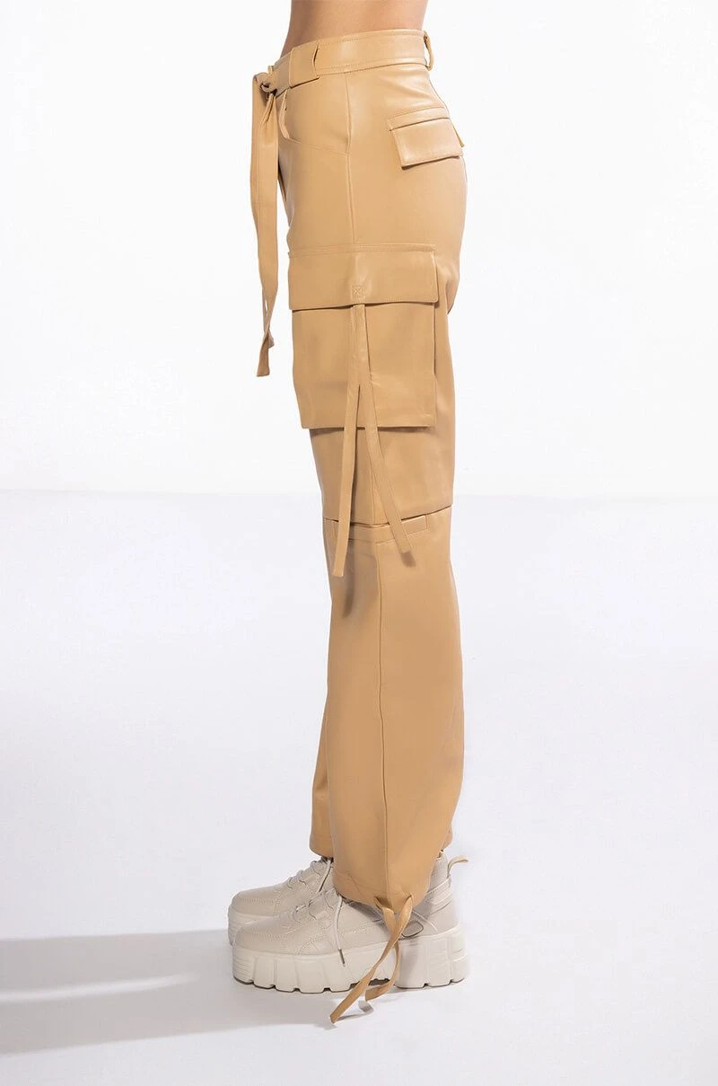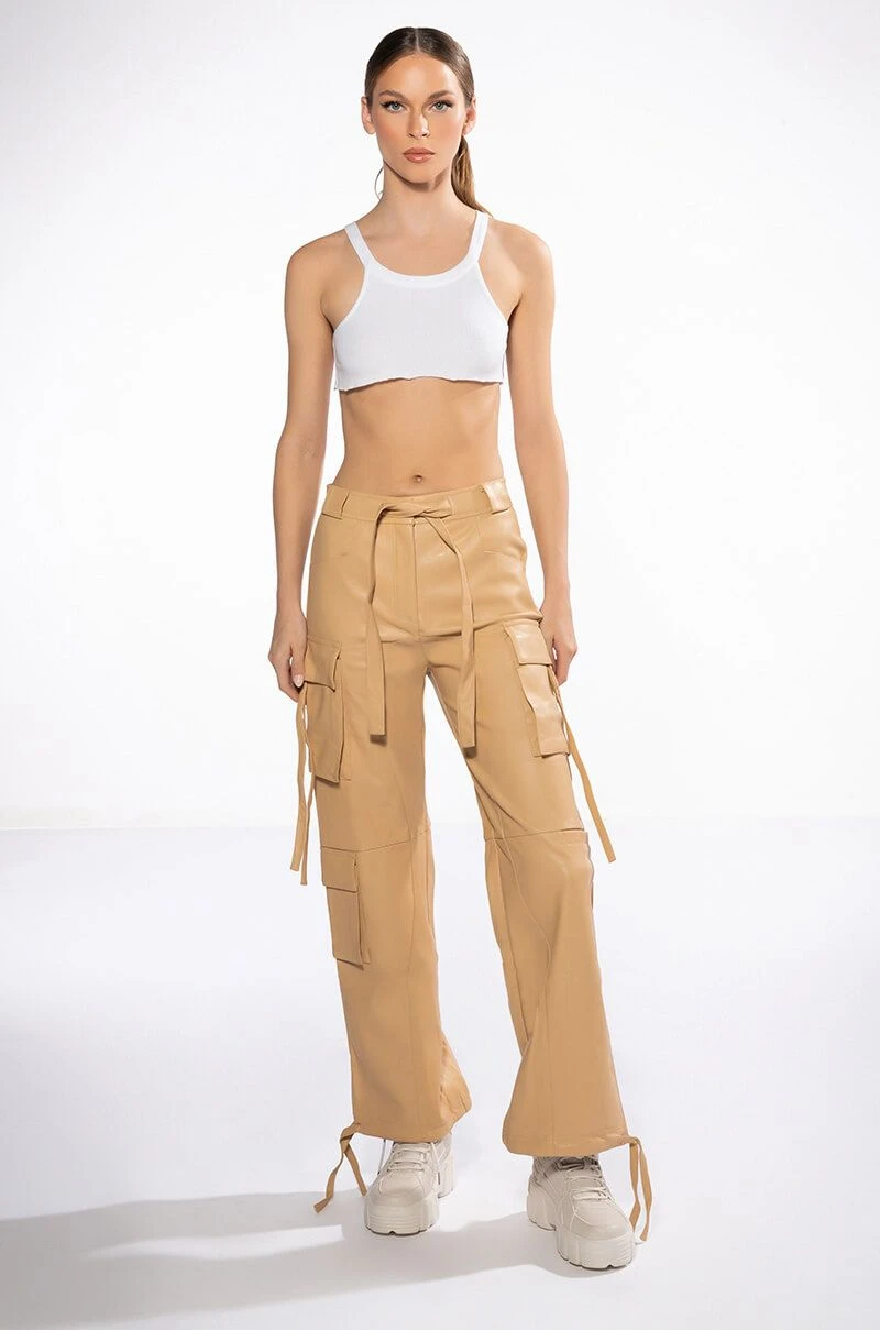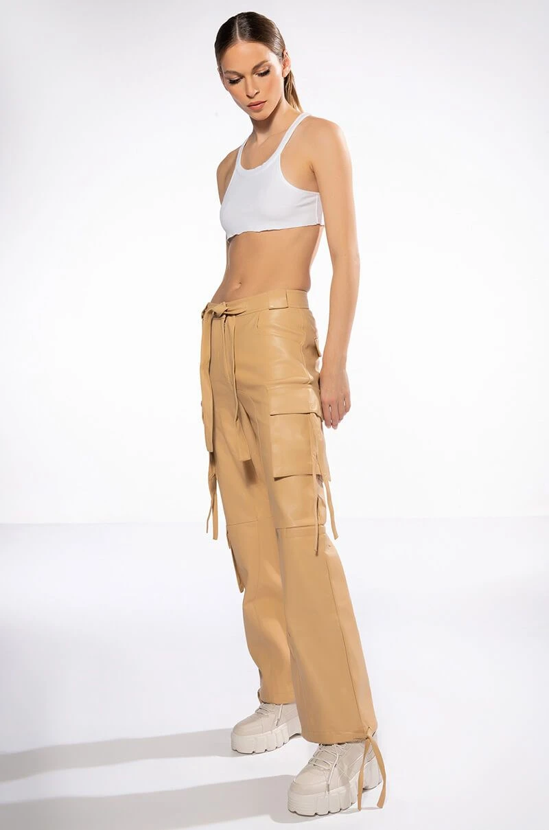The AKIRA Label Jazz Faux Leather Jogger is made from a pebbled vegan leather fabrication and features a high rise waist, working belt loops, patch pockets, cargo flap side pockets with faux leather straps, mock flap back pockets, a relaxed fit, and cinched ankles with faux leather tie detailing. Complete with a zippered hook and bar front closure with faux leather ties.