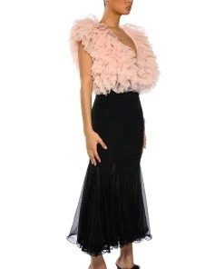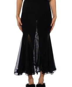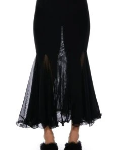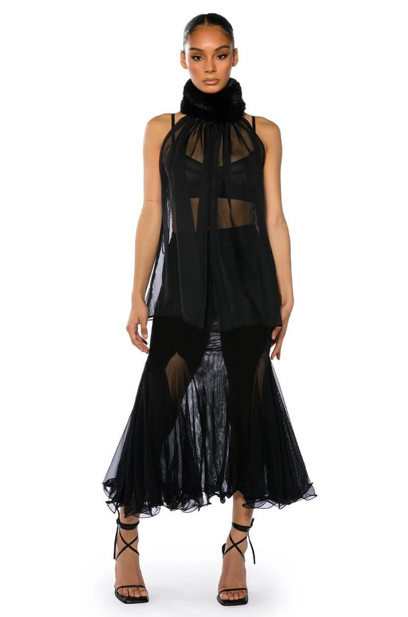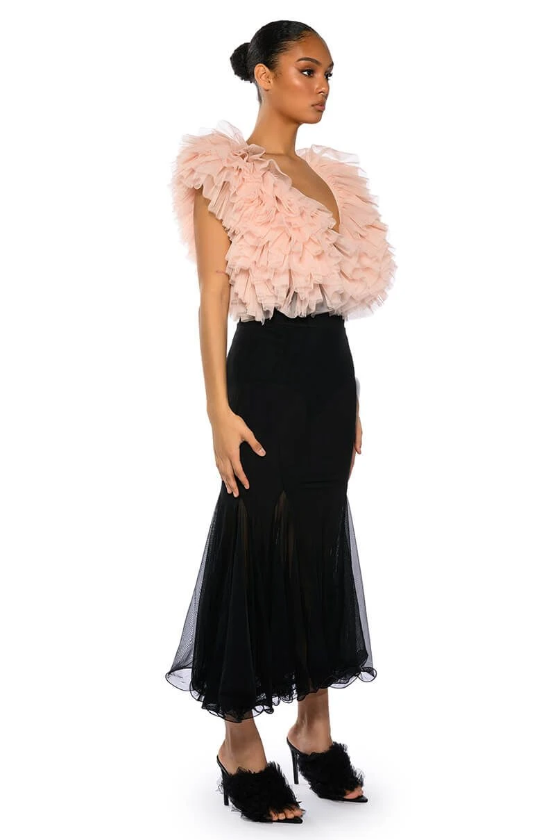 Set trends in The AKIRA Label Keep Up Mermaid Flare Mesh Midi Skirt. This sheer mesh piece features a wide elastic waistband, a midi length silhouette, a flattering flared mermaid hem, and a pull on fit.