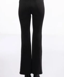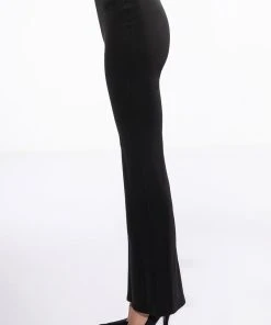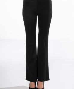 The AKIRA Label Know It All Curved Waist Flare Pants are made from a slick, stretchy fabrication and feature a high rise waist, a curved arch waistband with boning for structure, flared pant legs, and a tonal back zipper closure.