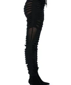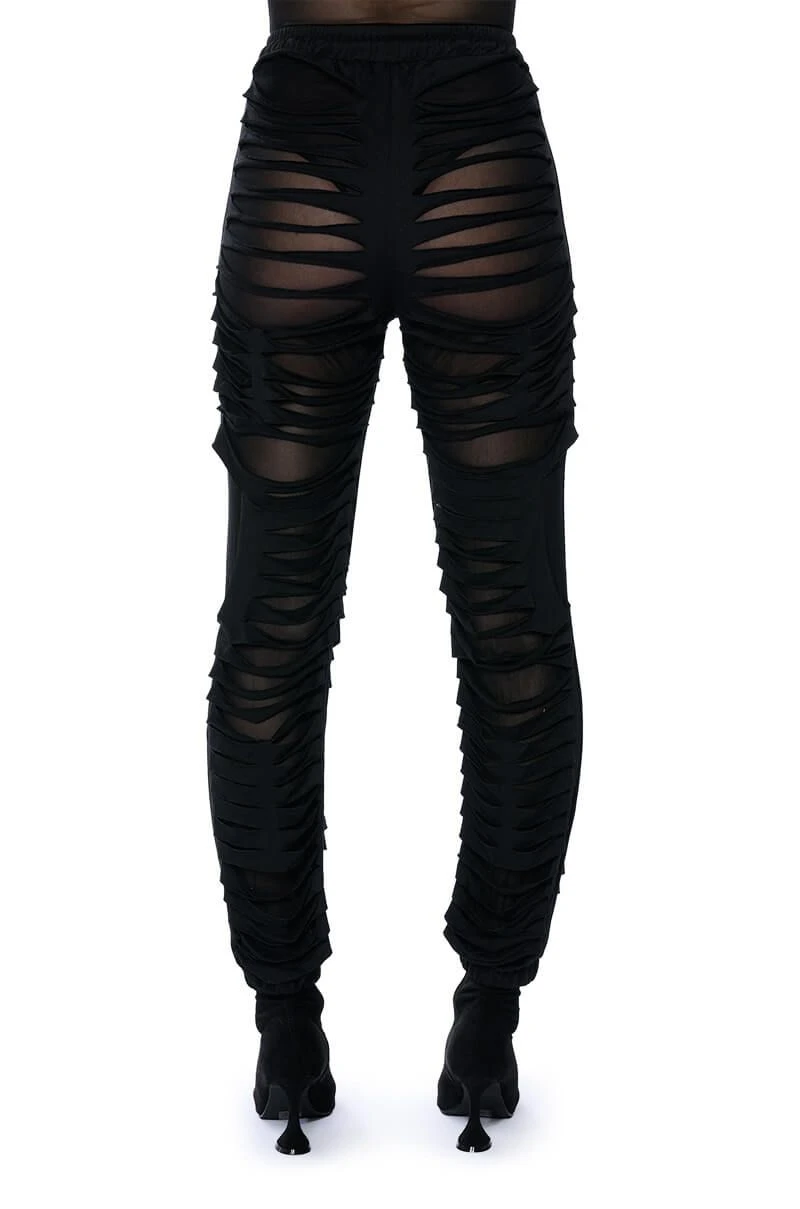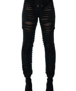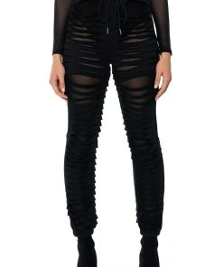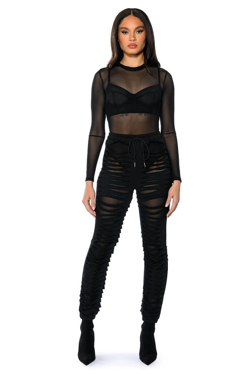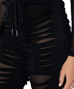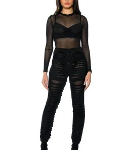 The Lennox Distressed Jogger is a sexy take on the classic jogger pants. Perfect for your new year’s wardrobe, these joggers are made with a mesh base fabrication and an overlay of distressed slit fabric. Complete with a drawstring elastic waistband, ruched elastic bottom hems, and a pull-on fit. Pair with a mesh long sleeve bodysuit and chunky shoes for a sleek athleisure look.