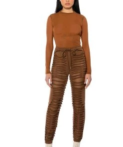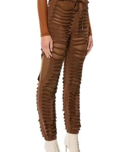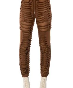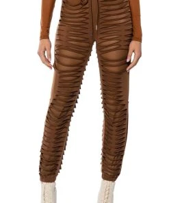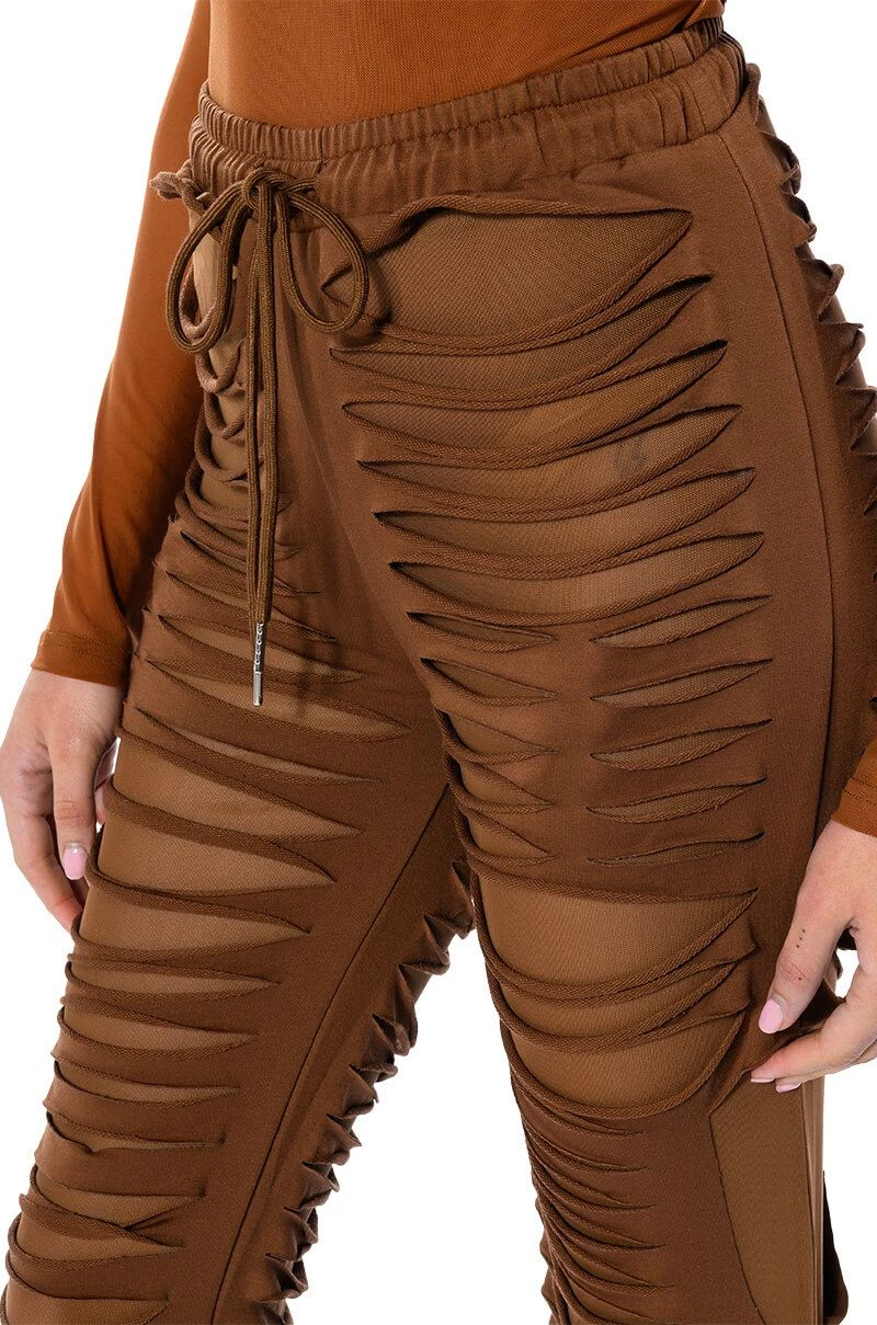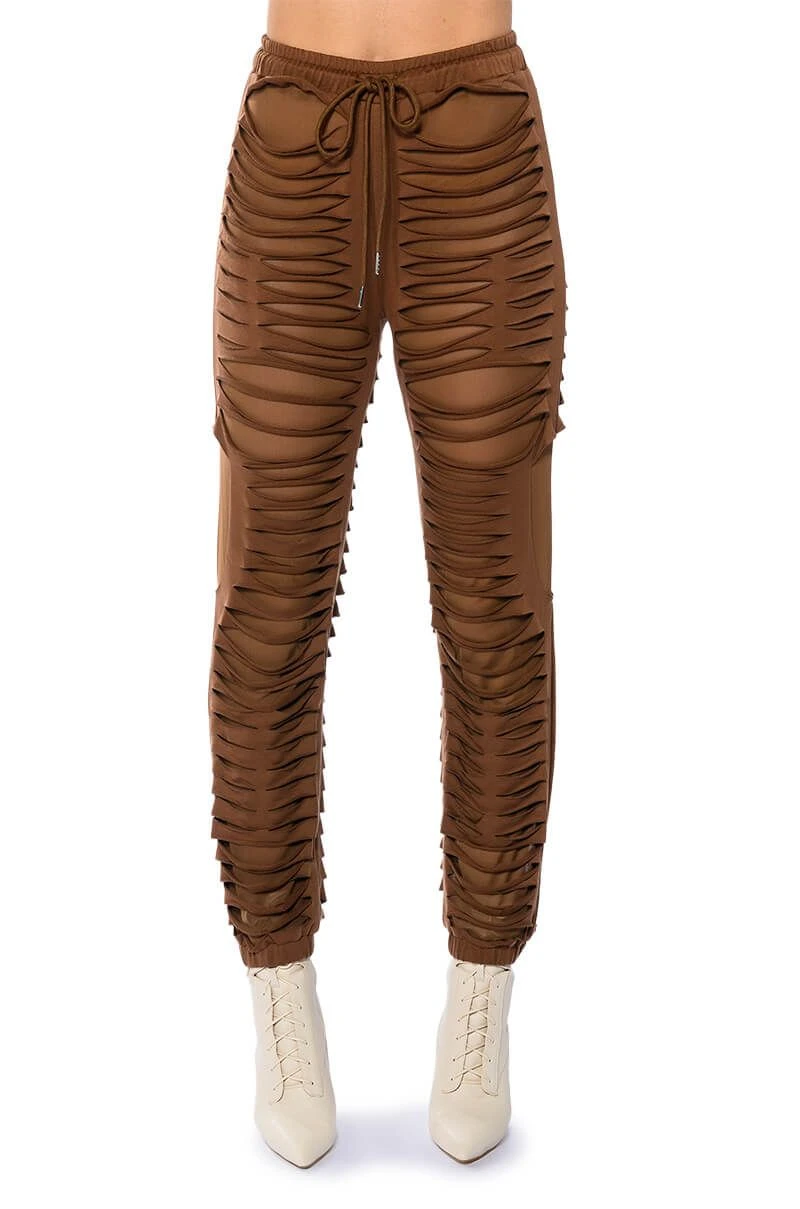 The Lennox Distressed Jogger is made from a cozy cotton fabrication and features a high rise waist, an elastic drawstring waistband, a sheer mesh inner layer, distressed cutout outer detailing, a skinny leg silhouette, and cinched elastic ankle hems. Pair this sexy sheer piece with a cropped hoodie and sneakers to complete your fresh athleisure look.