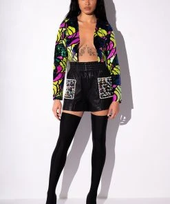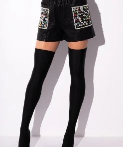 The AKIRA Label Lorie Gem Embellished Faux Leather Shorts feature a faux leather fabrication, a cinched elastic high rise waist, bead and rhinestone-embellished embellished front pockets. Complete with a faux front button detailing.