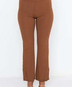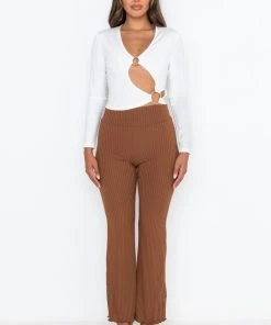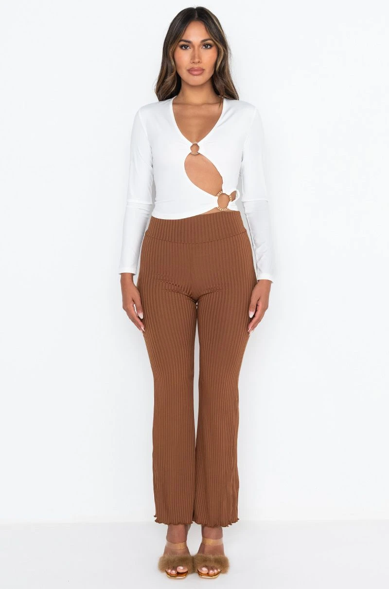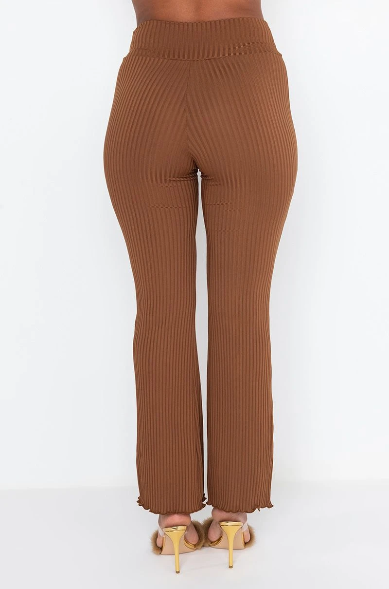 The AKIRA Label My Clarity Wide Leg Ruffle Pant is made from a ribbed fabrication, and is complete with wide pant legs, a lettuce trim hemline, and a stretchy high rise waistline.