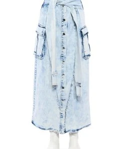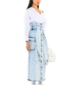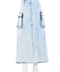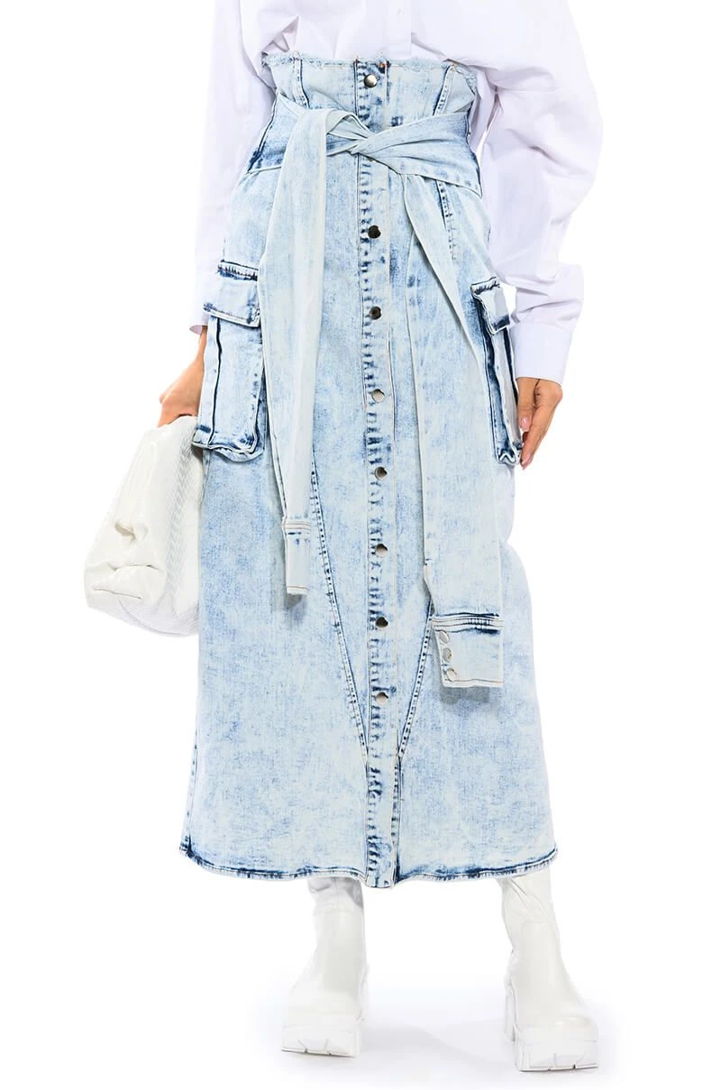 The AKIRA Label Next Up Bleached Denim Maxi Skirt is made from a bleached denim fabrication and features a frayed ultra high rise waist, cargo flap side pockets, a maxi length silhouette, and snap button front closures. Complete with mock denim jacket tie waist sleeve details.