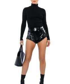 Go from the club to another club, and maybe even a bus in The AKIRA Label No Sleep Ruffle Booty Short. This faux leather mini short features pleated ruffled hems, a high rise waistline, and a back zipper closure. Complete your look with a glam captain hat, a sexy bodysuit, and your fave stomping boots.