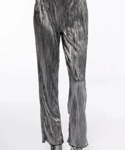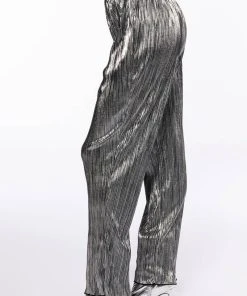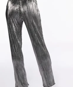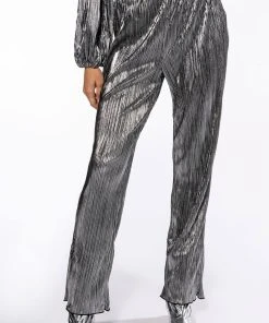 The AKIRA Label Noel Pleated Metallic Palazzo Pant is made from a pleated metallic fabrication and features a high rise waist, a shirred elastic waistband, a straight leg silhouette, lettuce trim hems, and a pull-on fit. Pair this piece with the matching AKIRA label noel pleated tie front metallic peplum blouse to complete your look.