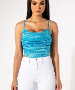 The AKIRA Label Nova Girl Rhinestone Cowl Neck Tank is made from a satin fabrication and features adjustable spaghetti straps, a cowl neckline, attached padded cups, rhinestone body detailing, boning for structure, and a tonal back zipper closure.