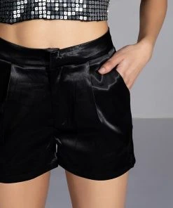 The AKIRA Label Passione Satin Shorts feature a slightly stretchy satin fabrication, a high rise silhouette, a pleat front design, on seam side pockets, and a hook and eye front zipper closure. Pair with the coordinating AKIRA Label Passione Satin Blazer for a complete look.