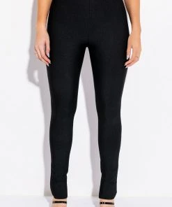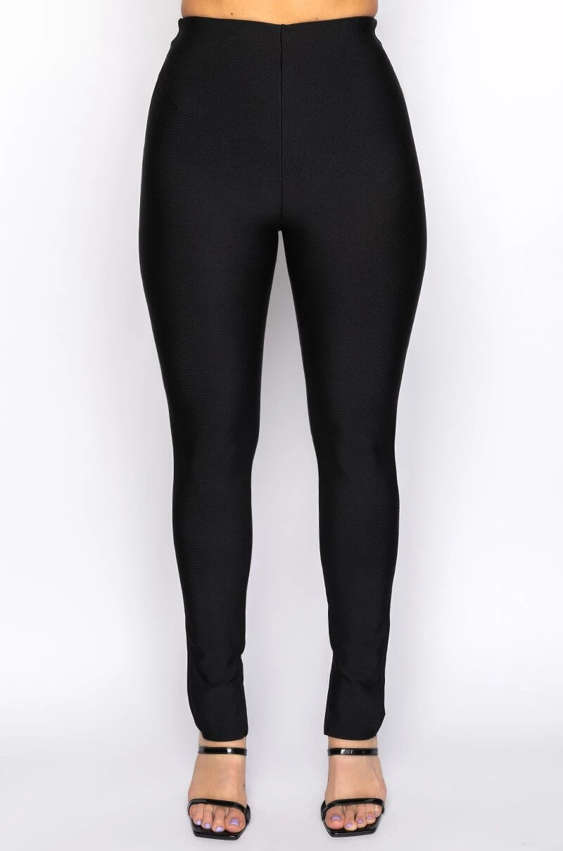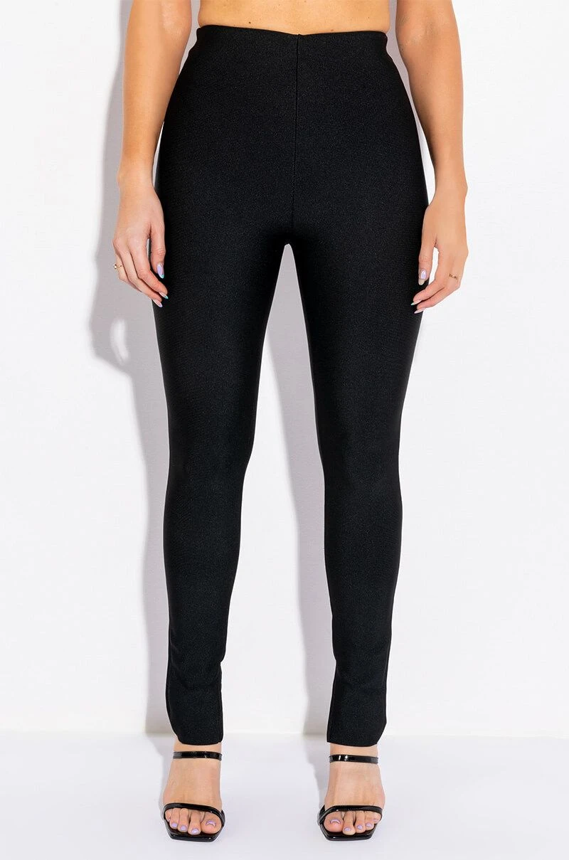 The AKIRA Label Pinkies Up Bandage Skinny Pants features a stretch bandage knit fabrication, flat front design, inner elastic waistband, and cigarette pant silhouette. Complete with a high rise waist, concealed zip back closure, and inner ankle slits.