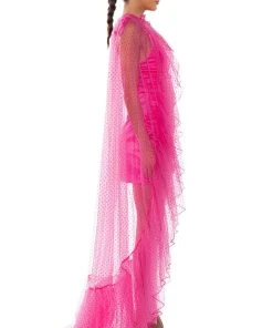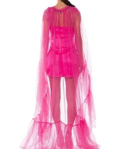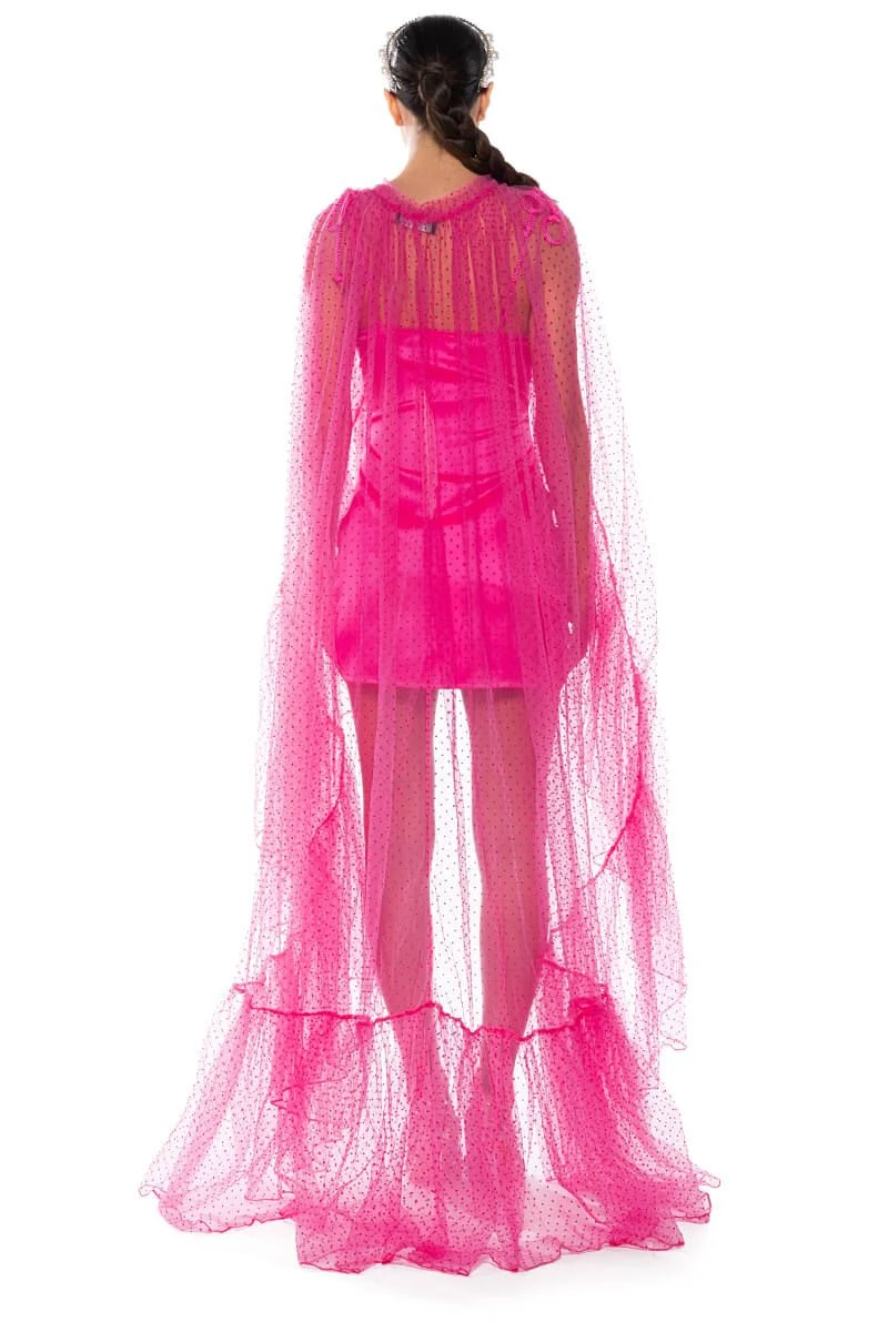 The AKIRA Label Polka Dot 2-in-1 Cape Belt Duo is a unique number made from a sheer mesh base, featuring a raised velvet polka dotted design, a front bow-tie closure, and a multifunctional layered cape or belt design. Complete your bold and dramatic look with this piece, tie around the waist for a glamorous train skirt or over the shoulders as a cape.