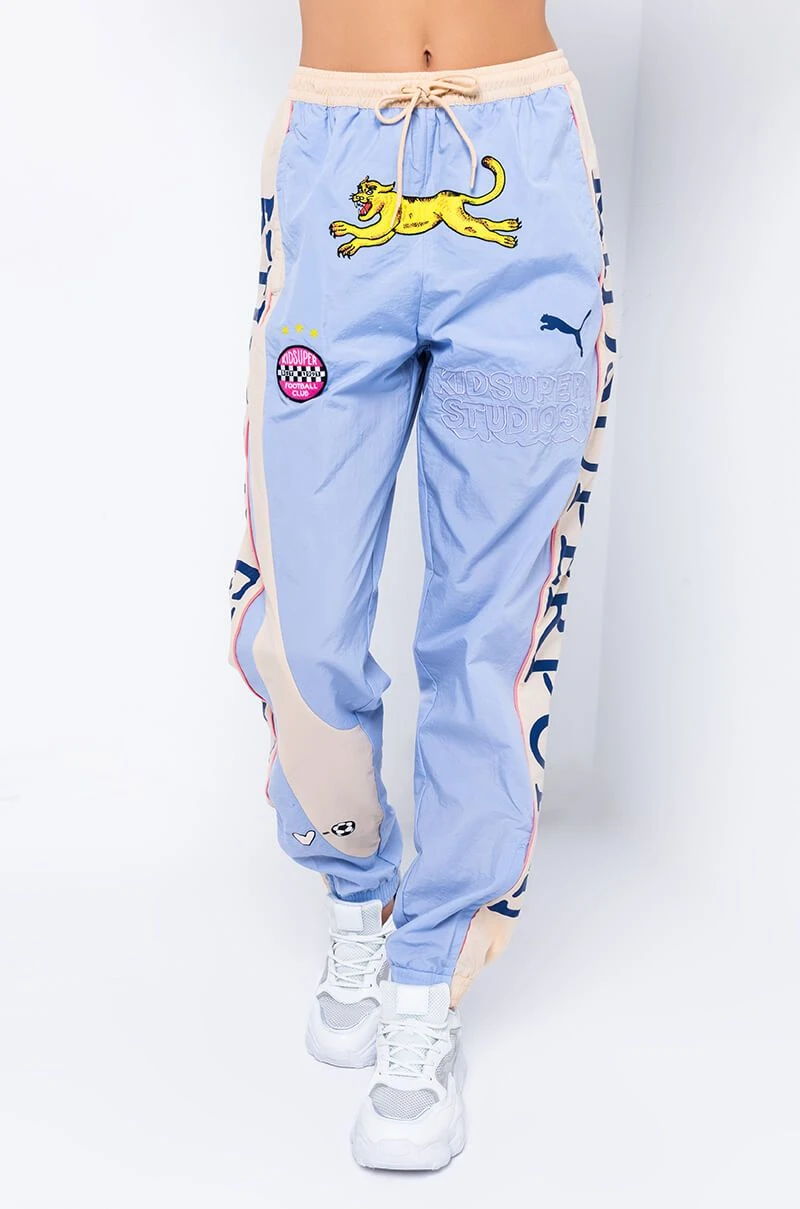 Sport these fun track pants that are a delicious creative collaboration with Kid Super + PUMA. These baby blue and tan track pants feature a variety of decorative patches designed by illustrator Kid Super. The words “Kid Super PUMA”, are printed on the side of each pant leg in navy blue graphics. The words, “Kid Super Studios”, are stitched in baby blue on the front of the left thigh beneath a classic PUMA logo in navy blue. “Follow the Love”, is stitched in yellow on the left butt cheek opposite a slash pocket that hides a matching zipper. Wear with the matching PUMA & Kid Super Color Block Tee and your favorite pastel sneakers for a graphic sport look.