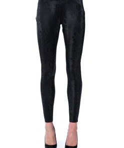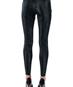 The AKIRA Label Rio Print High Rise Leggings With 4 Way Stretch in Black are the perfect faux leather leggings to get you through fall and winter. The stretchy leggings are complete with an elasticated waistband, a high rise fit, a snakeskin print faux leather fabrication, and a bodycon ankle length silhouette. Style them with a slouchy sweater and thigh high boots for a stylish wintery look.