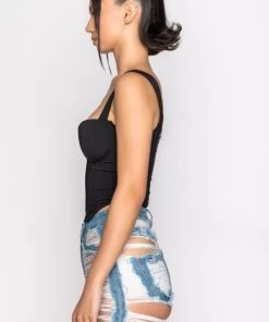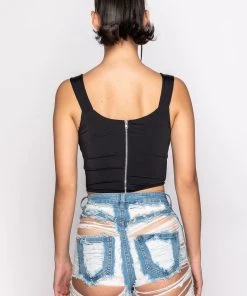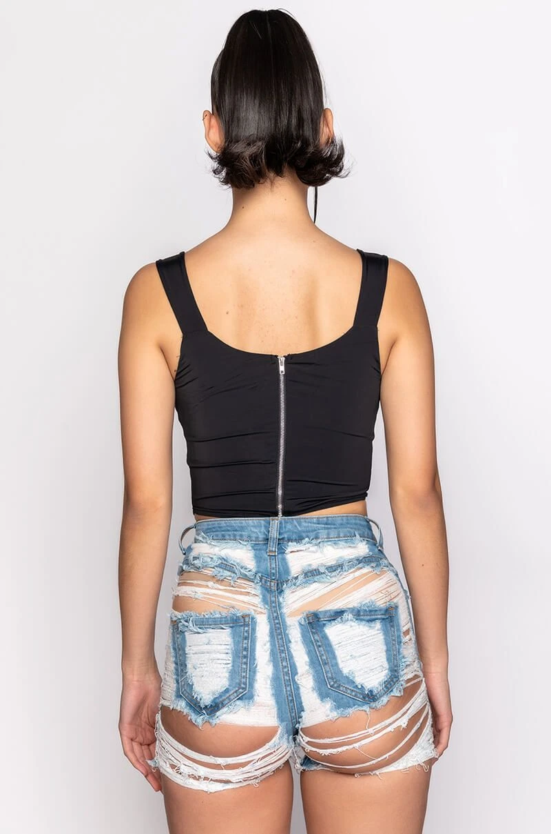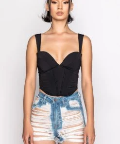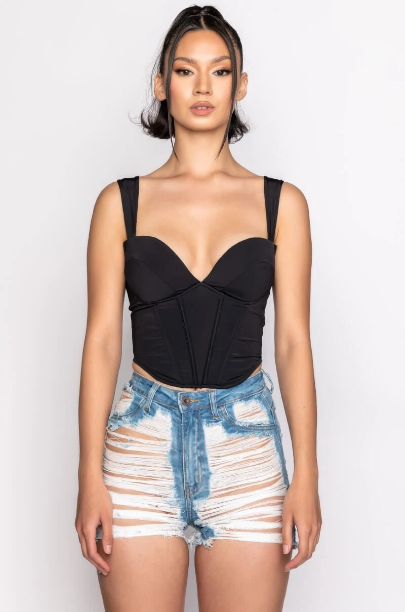 The AKIRA Label Smoke Signals Corset Tank is made from a slick and stretchy fabrication and features wide tank straps, a sweetheart neckline with padded cups, a corset bodice with boning for structure, a rounded hem, and an exposed back zipper closure.