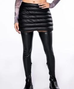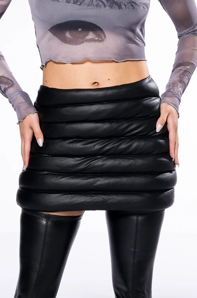The AKIRA Label Star Chasing Mini Skirt in Black is a futuristic piece featuring a soft yet sleek fabrication, a quilted puffer front, a thin elastic back band, a sexy ultra-mini silhouette, and a back zipper closure. Pair with an oversized band tee or a chic white cropped tank to complete your out of this world ensemble.