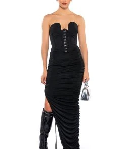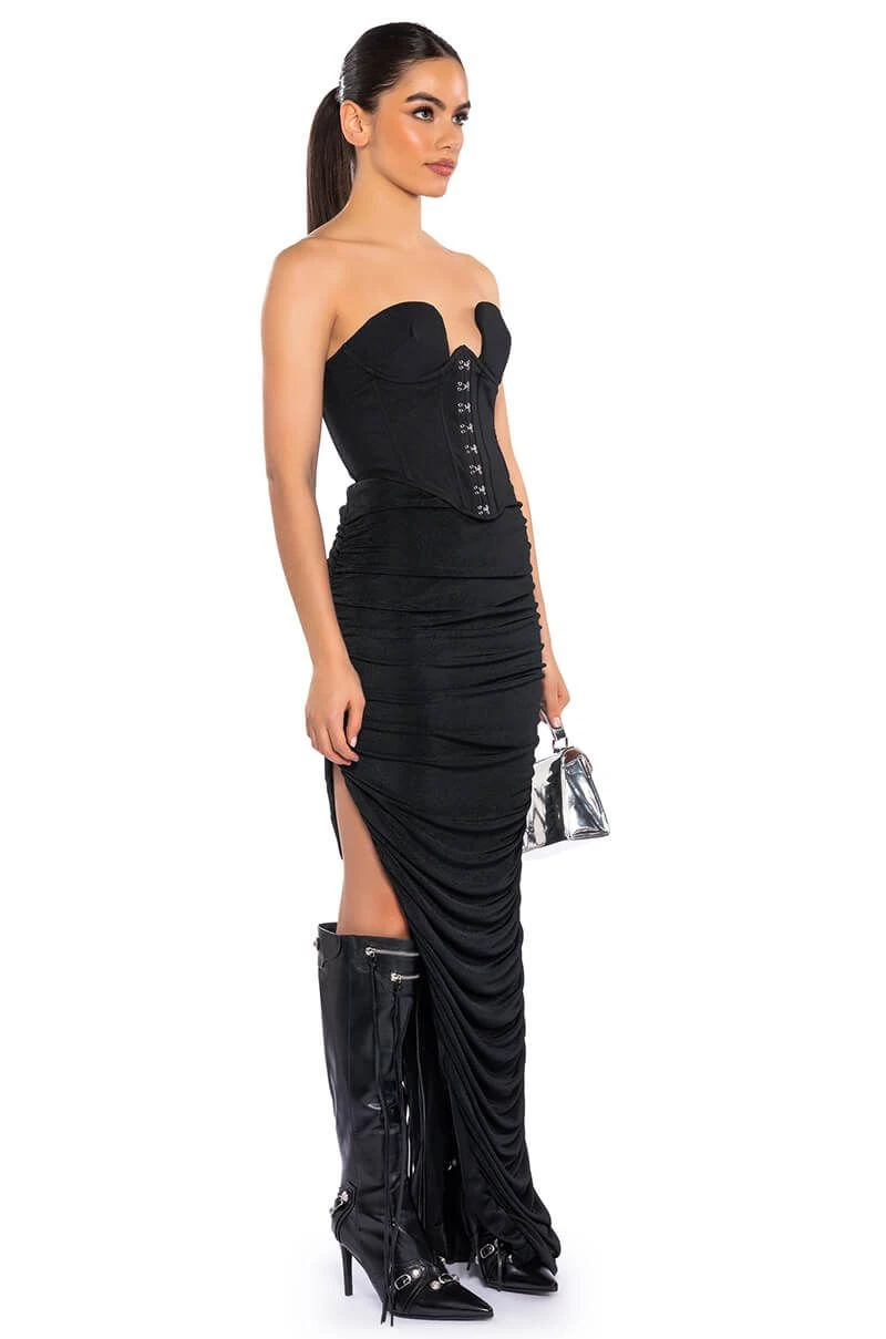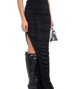 Give ‘em something to talk about in The AKIRA Label Talk About It Ruched Maxi Skirt. This stretch jersey maxi skirt features an elastic waistband, a bodycon silhouette, ruched detailing throughout, and a sultry side slit accent. Complete with a smooth inner lining and a pull on fit.