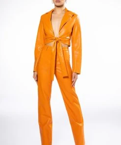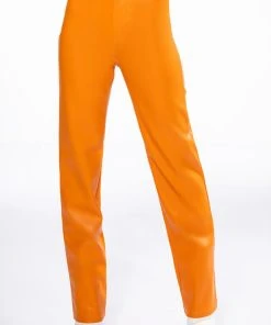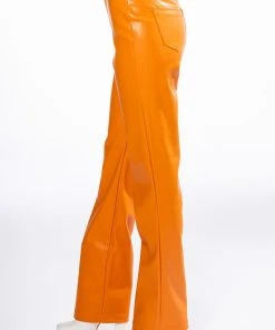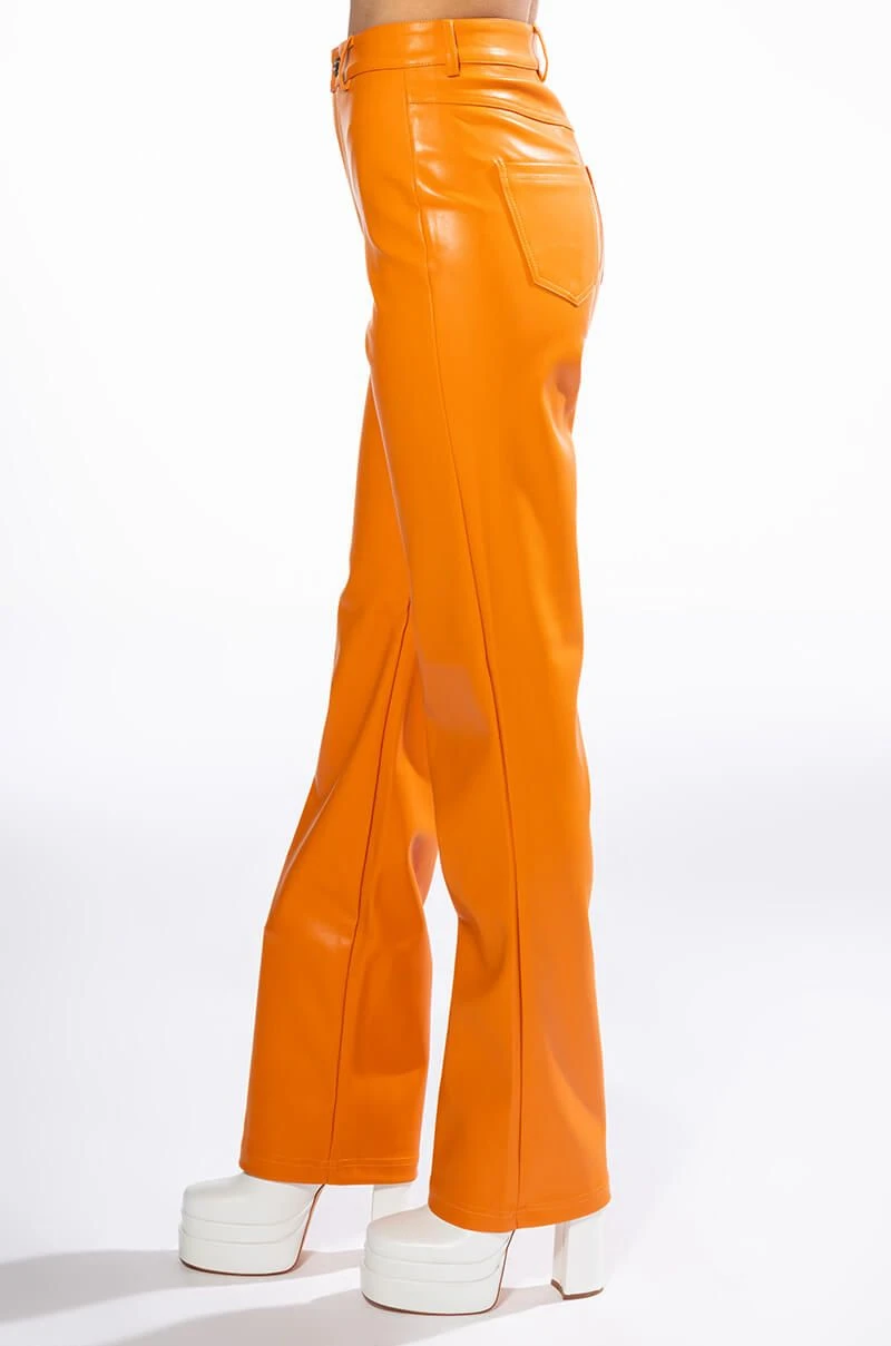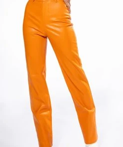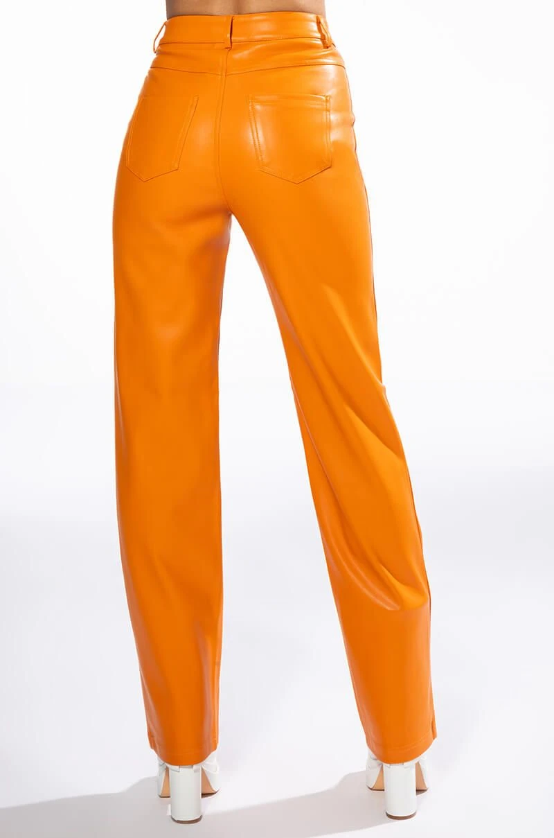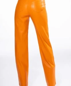 ¡Con mucho amor! The AKIRA Label Te Quiero High Rise Vegan Leather Straight Leg Pants In Orange are a stretchy vegan leather pant featuring a soft fleece lining, belt loops, a high rise waistline, two back pockets, and wide leg silhouette. Complete with a front button and zipper closure.