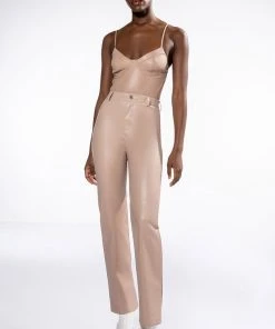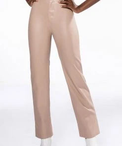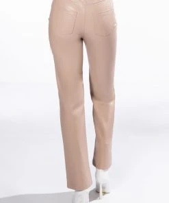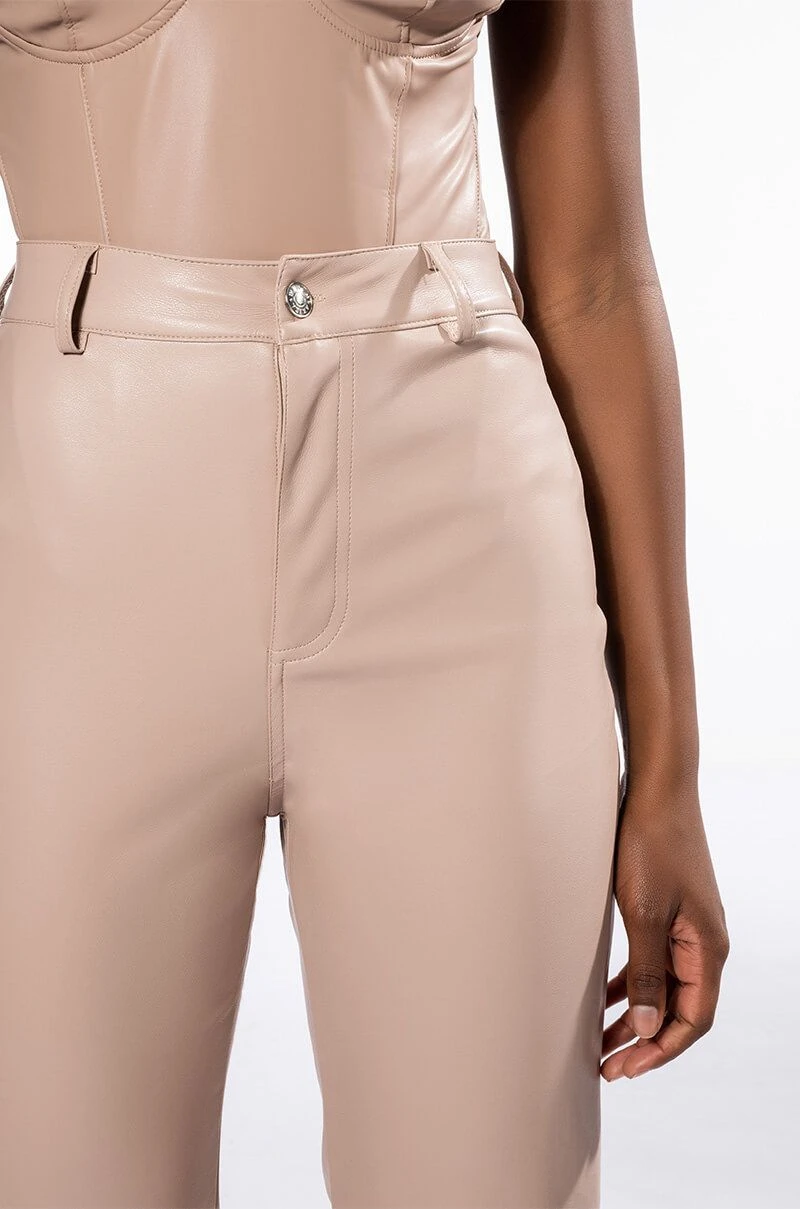 ¡Con mucho amor! The AKIRA Label Te Quiero High Rise Vegan Leather Straight Leg Pants In Pink are a stretchy vegan leather pant featuring a soft fleece lining, belt loops, a high rise waistline, two back pockets, and wide leg silhouette. Complete with a front button and zipper closure.