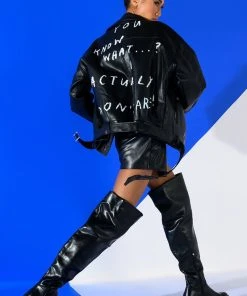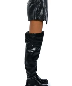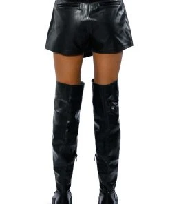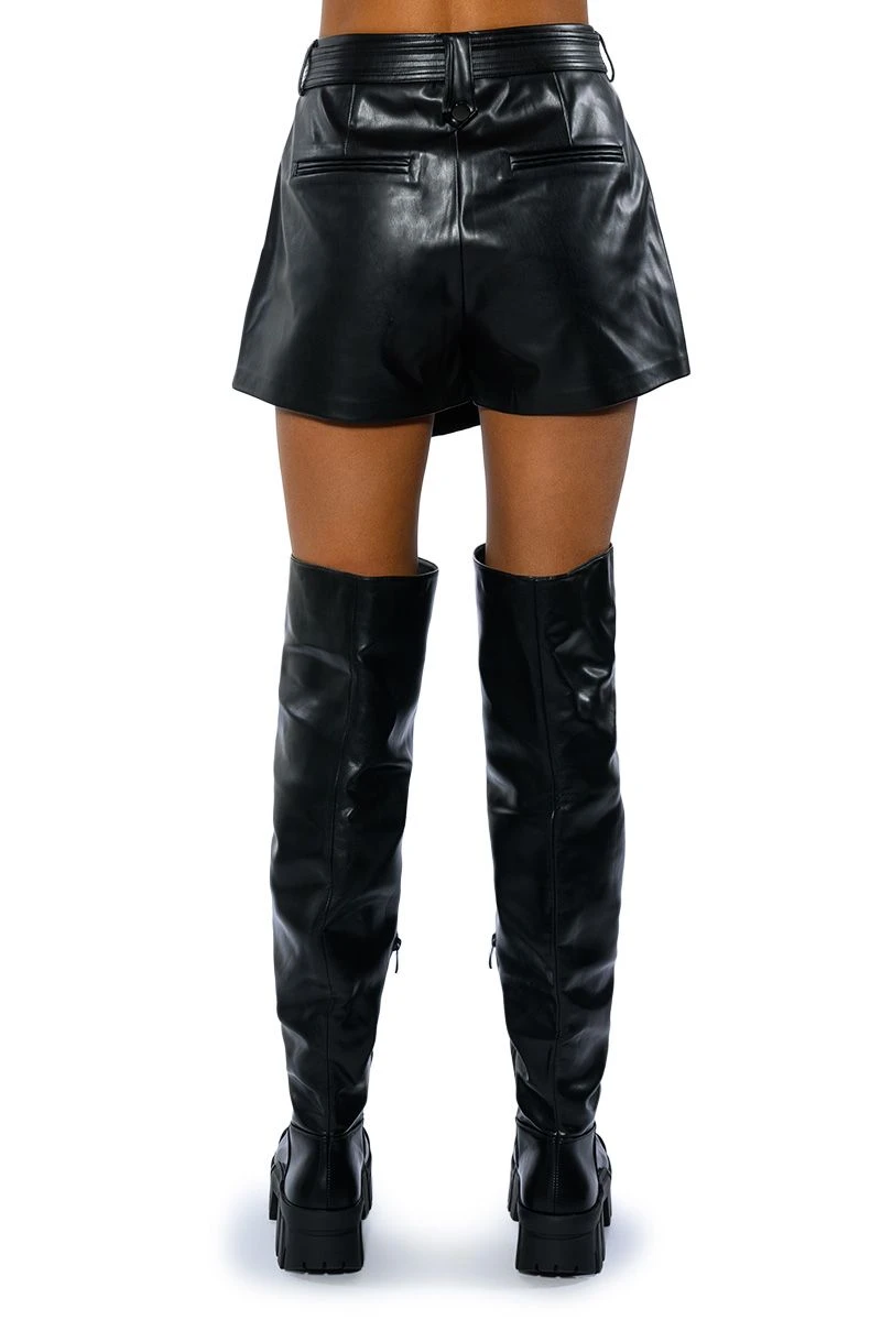 The AKIRA Label The Baddest Belted Faux Leather Skort With 4 Way Stretch features a stretchy vegan leather fabrication, a wrap front design, side zipper closure, inner shorts, and a push lock buckle belt. Complete with functional belt loops, a soft inner lining, and welted faux back pockets. your look with a cozy cropped cardigan and a pair of chunky booties.