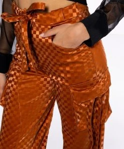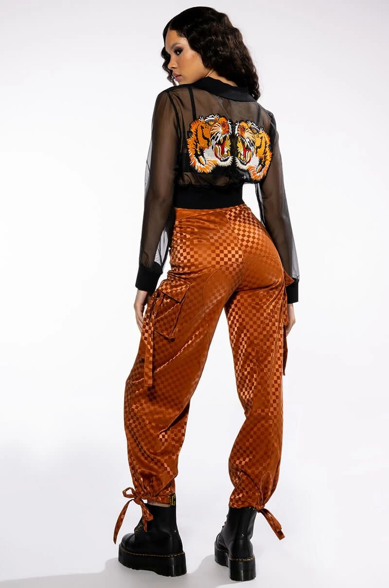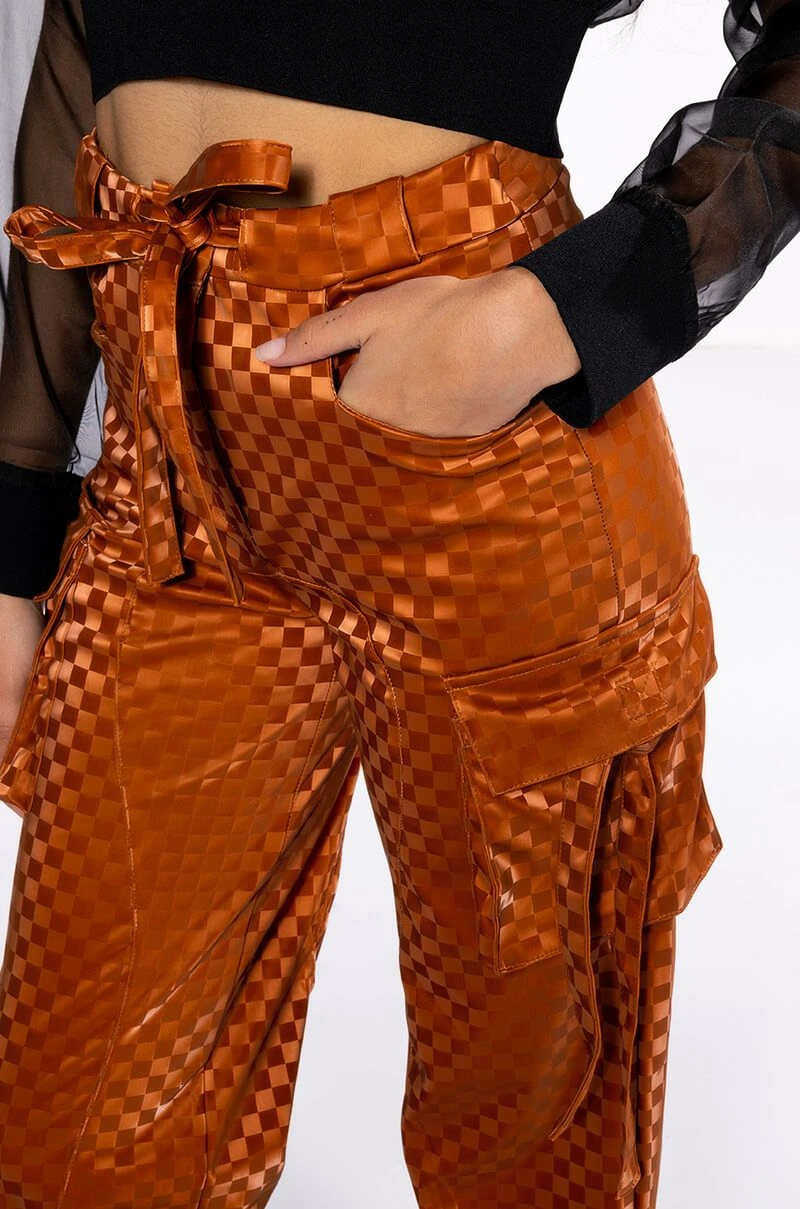 The AKIRA Label Uncovering Your Tracks Checkered PU Cargo Pants are made from a glossy vegan leather fabrication and feature checkered patterning, a high rise waist, working belt loops, patch pockets, cargo flap side pockets with faux leather straps, a relaxed fit, and cinched ankles with faux leather tie detailing. Complete with a zippered hook and bar front closure with faux leather ties.