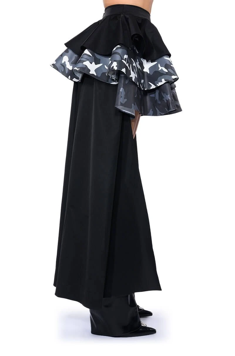 The AKIRA Label Unbothered High Low Hem Ruffle Maxi Skirt is made from a slick fabrication and features a high rise waist, a wide waistband, layered camo print ruffles with netting, a high low hem, a maxi length silhouette, and an exposed back zipper closure. Style this piece with a mock neck bodysuit and knee high boots to complete your fierce look.